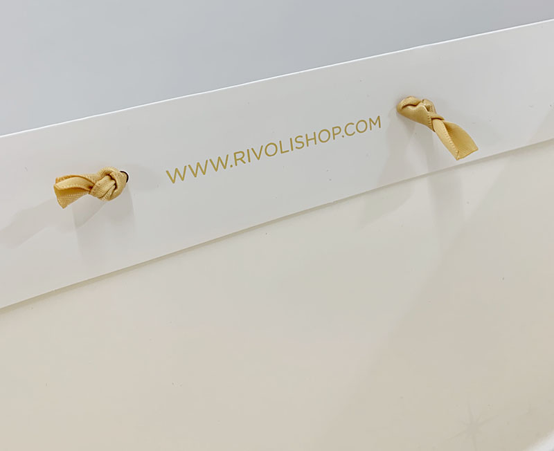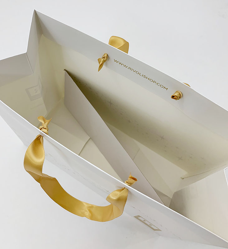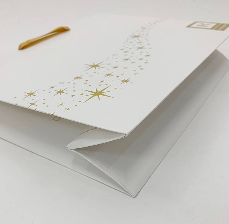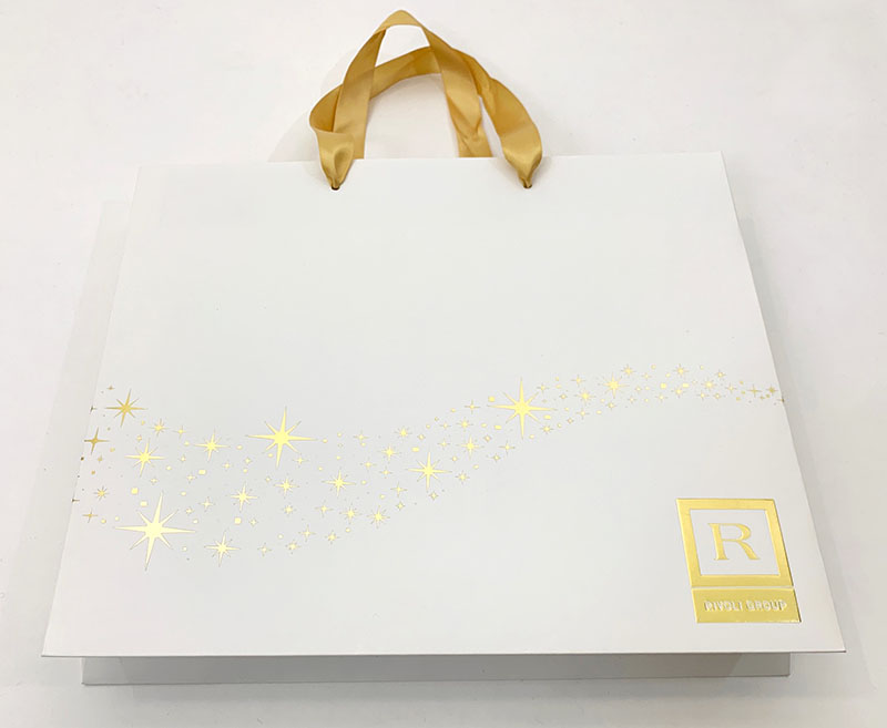 スッキリと白いコート紙をベースに贅沢な箔押し使いの紙袋です。