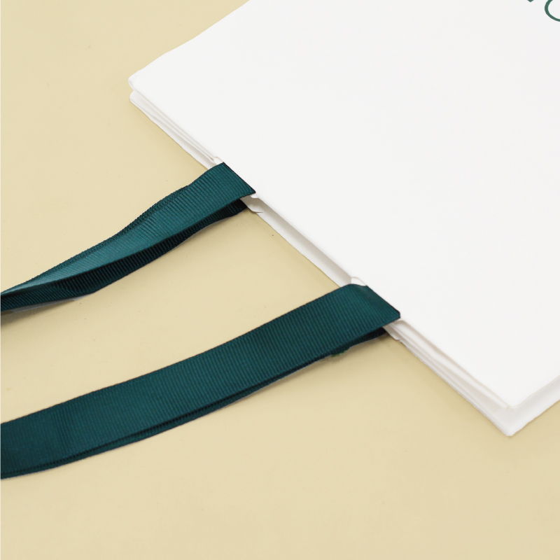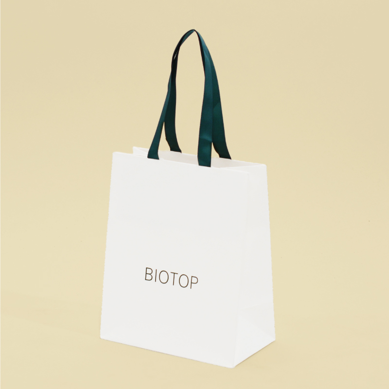白クラフト紙に緑のリボンとロゴのナチュラルな紙袋