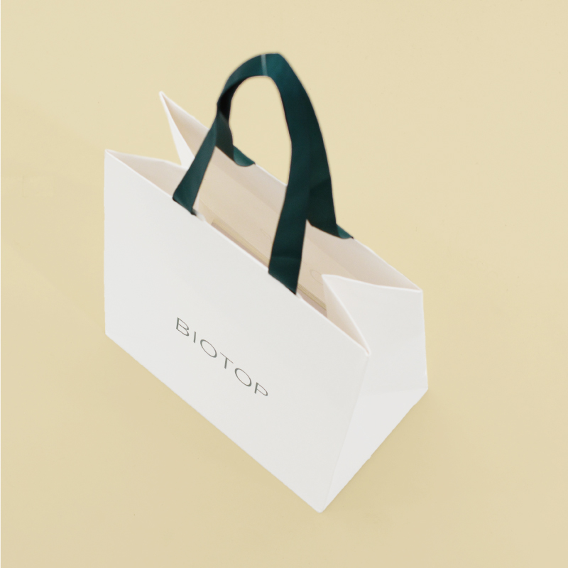 弊社でも取り扱いのある白い紙にワンポイントので構成された紙袋。