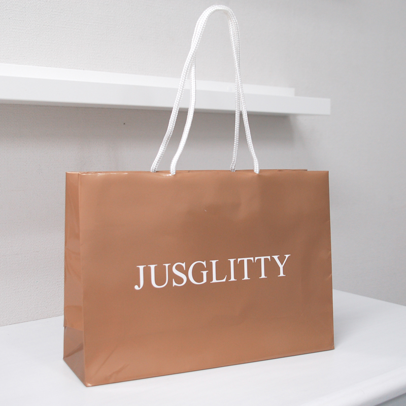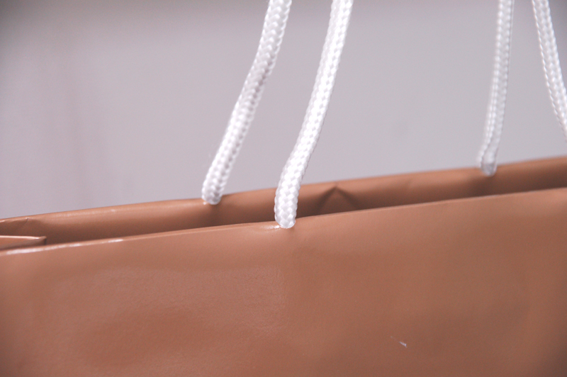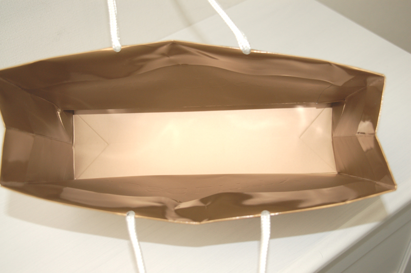 シンプルなゴールドが素敵なショップ袋2012年05月06日 こんにちはベリービーの芦谷です。 今日はとってもシンプルでゴールドが素敵な紙袋をご紹介します。 グロスPPの光沢でゴールドの印刷を強調した、 とってもシンプルなデザインの紙袋です。 ロゴは紙の地色である白を生かし、 浮き出しにすることで高級感を醸し出しています。 手提げ紐は丸紐を縦穴で留めています。 内側もゴールドが全面に印刷されています。 とっても大人っぽいデザインが素敵ですね。