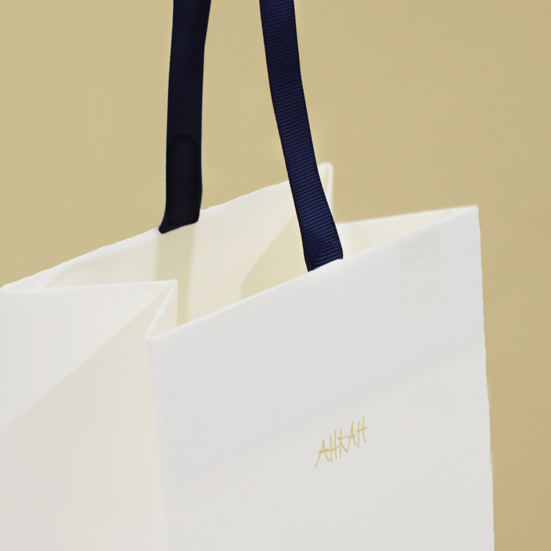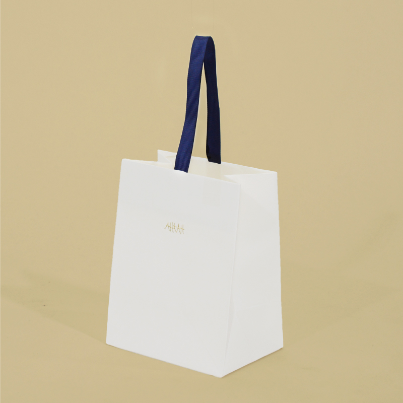ホワイトをベースとした紙袋。本体を白、小さなロゴが箔押しの金色で綺麗ですね。