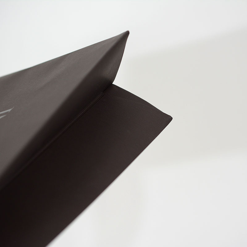 通常の折り方ですと片面、今回の紙袋で言えばロゴ下部付近に折り筋が入ってしまいますが、