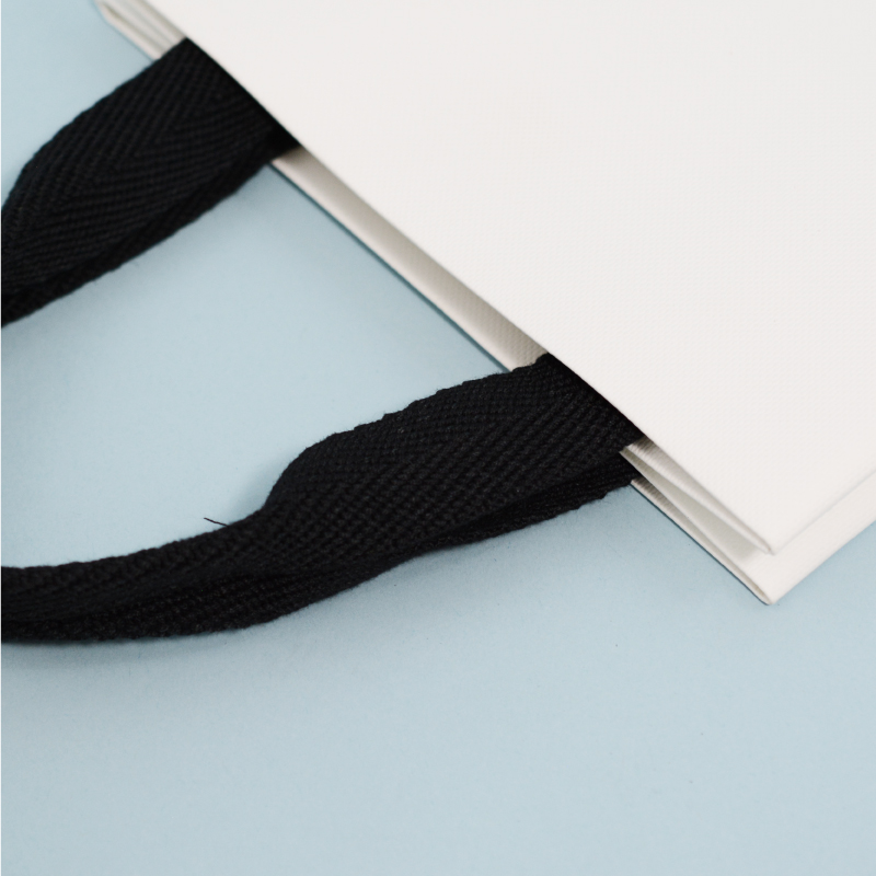 ハンドルはアクリル平紐を縦留めしています。印刷のカラーに合わせた黒のハンドルは締まりがあってカッコいいですね。