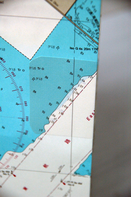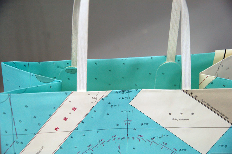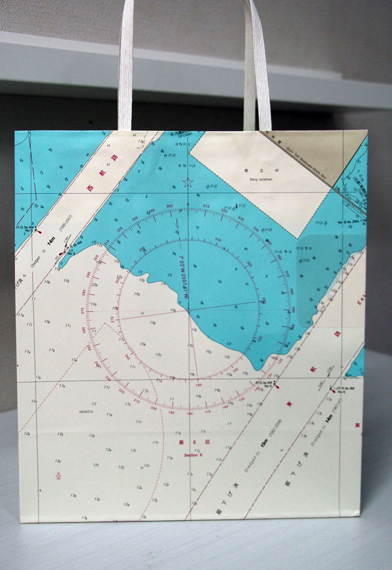 海図を再利用した紙袋2012年05月12日 こんにちはベリービーの芦谷です。 今日はとっても珍しい 海図を再利用した紙袋をご紹介いたします。 実際に漁師さんや船舶の航海士が利用していた海図が 改訂のために廃棄となり、紙袋に再生したものです。 所々に書き換えられて修正シールが貼られているのがリアルです。 エコに徹するためか 手提げ紐は紙バンドを使用しています。 このアイデアを利用して いろんな紙製品を紙袋に再生すると面白いですね!!