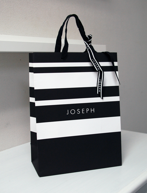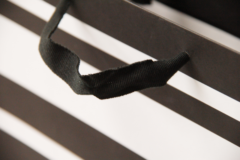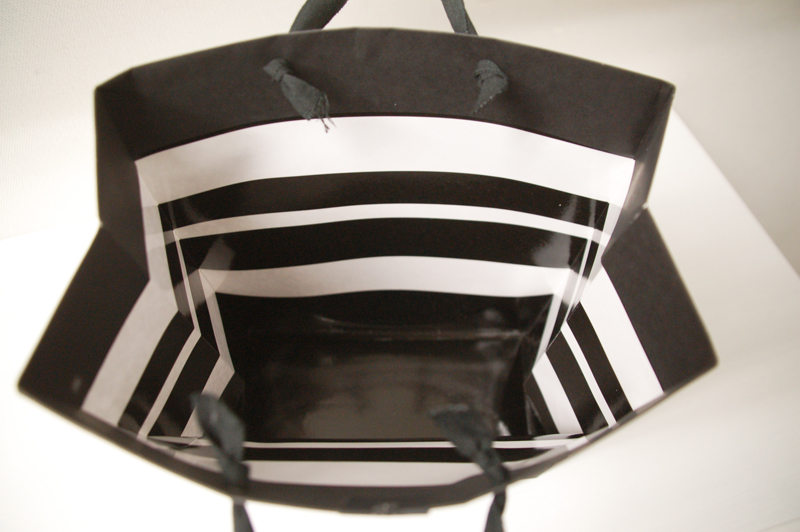 大人っぽいモノトーンのショップ袋2012年05月20日 こんにちはベリービーの芦谷です。 今日はとても大人っぽいモノトーンがカッコイイ紙袋をご紹介します。 シンプルなモノトーンが印象的です。 手提げ紐にかけられたリボンが マニッシュになりすぎず、フェミニンなイメージを持たせていますね。 手提げ紐は真っ黒いグログランテープ。 内側にもモノトーンのストライプが紙袋の内側に印刷されています。 徹底したモノトーンがとってもカッコイイ大人っぽい紙袋ですね。