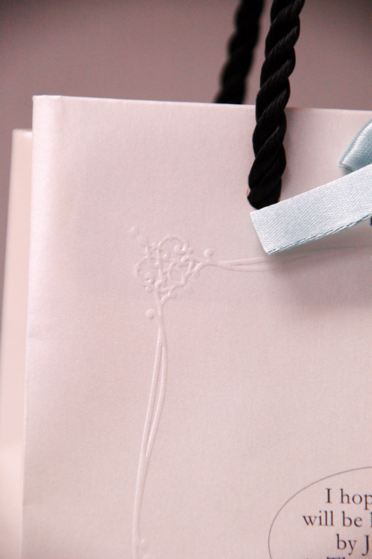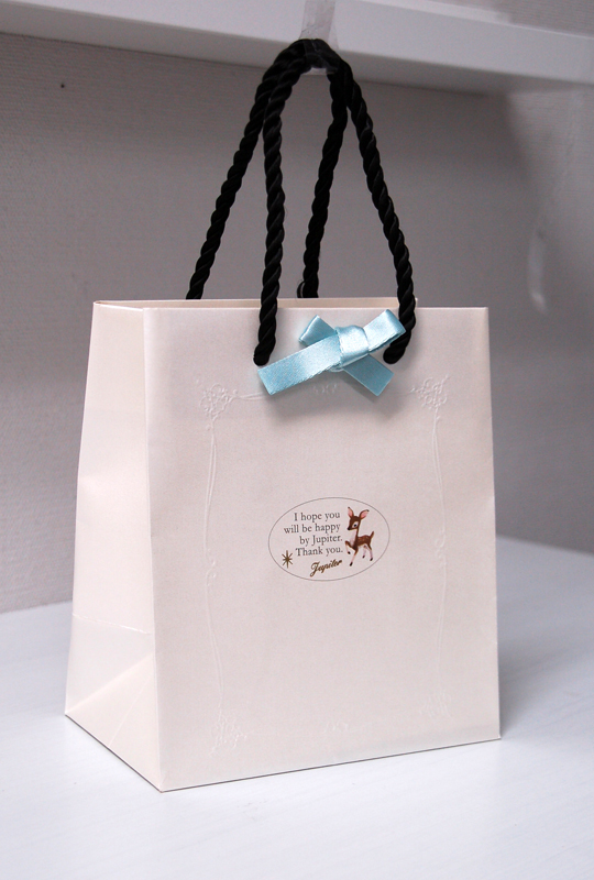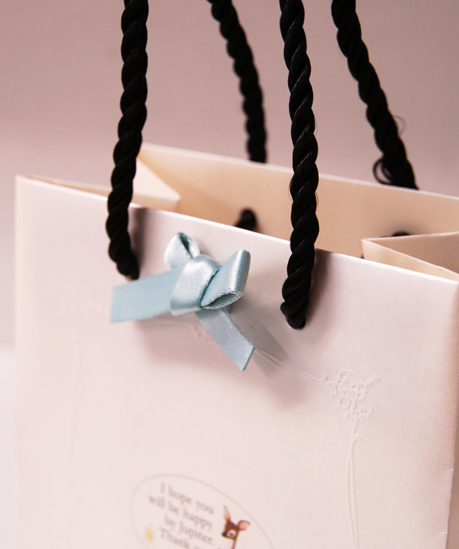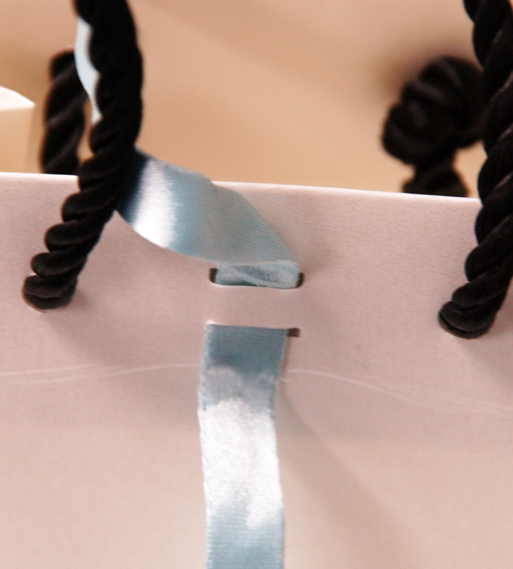 エンボスとリボンがとても可愛いショップ袋2012年05月25日 こんにちはベリービーの芦谷です。 今日はとってもかわいい紙袋をご紹介します。 ターコイズブルーのリボンがアクセントとなっています。 このリボン、ちょっと珍しい取り付け方がされています。 紙袋の片一方のだけに穴が開けられ、 口ボールとの間にリボンが通されていました。 アンティークな額縁を思わせる浮きだしエンボスも この紙袋のキュートさを強調しているんですね。