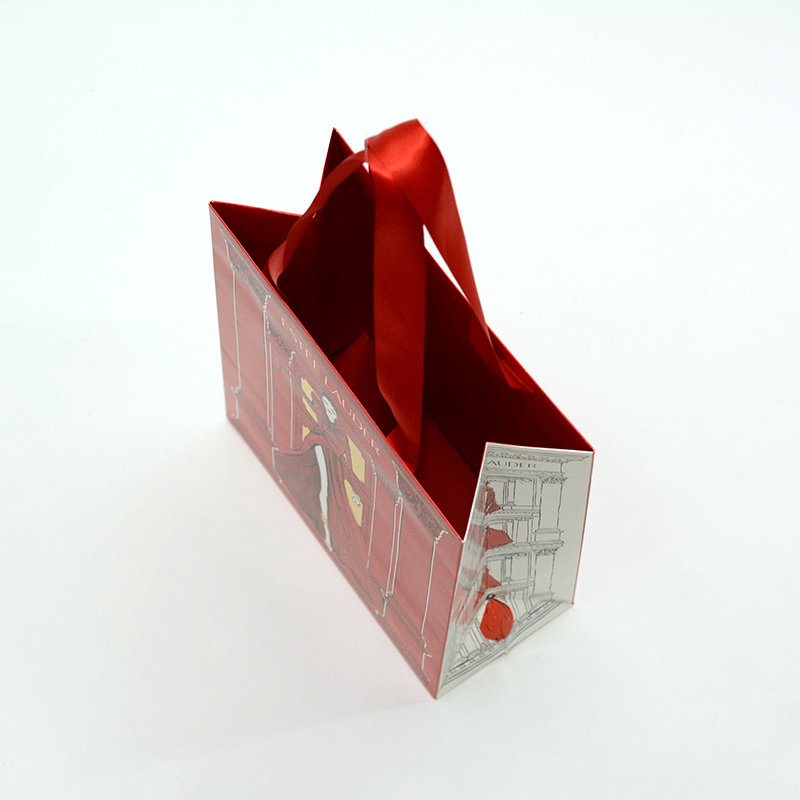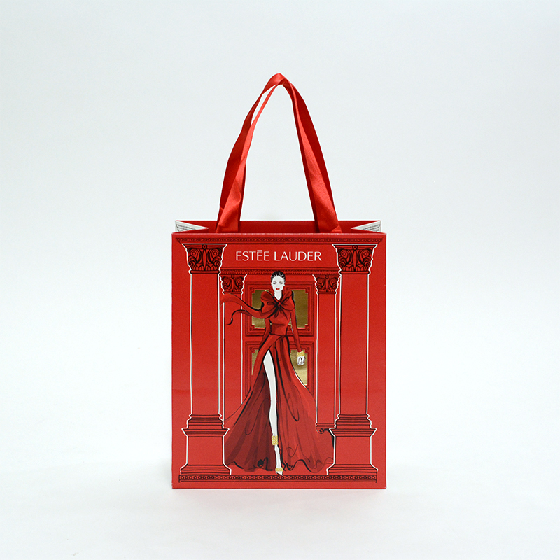 目が覚めるようなレッドと、女性のイラストでデザインされた紙袋になります。