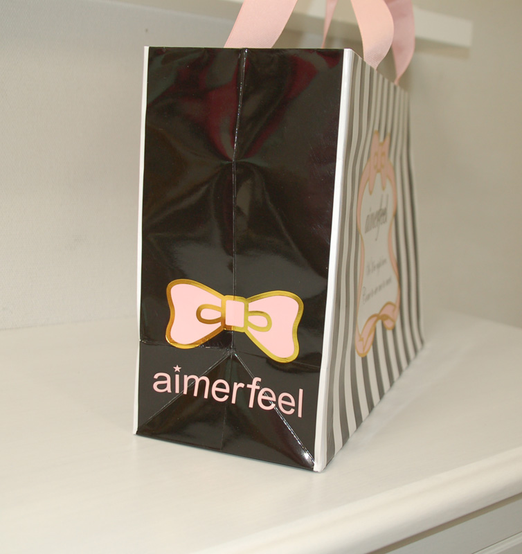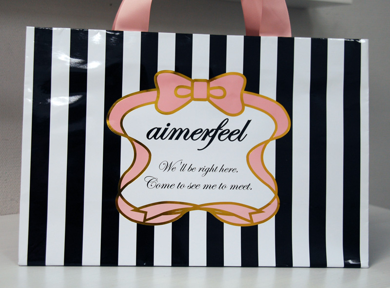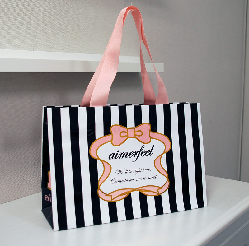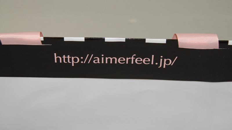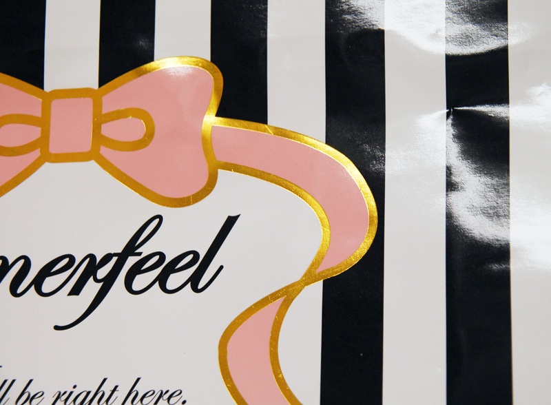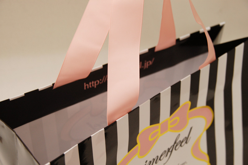 豪華な箔押しがキュートな紙袋2012年05月30日 こんにちはベリービーの芦谷です。 今日もとってもかわいい紙袋をご紹介します。 女性に大人気のストライプとリボンを組み合わせたデザインです。 表面加工のグロスPPとのバランスもピッタリですね。 リボンはゴールドの箔押しです。 サイドにも豪華な箔押し処理!! モノトーンに対して、ヌードピンクのグログランテープがおしゃれですね。 バランスのいいキュートな紙袋をご紹介しました。