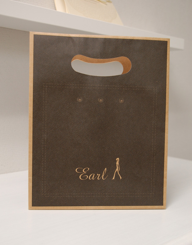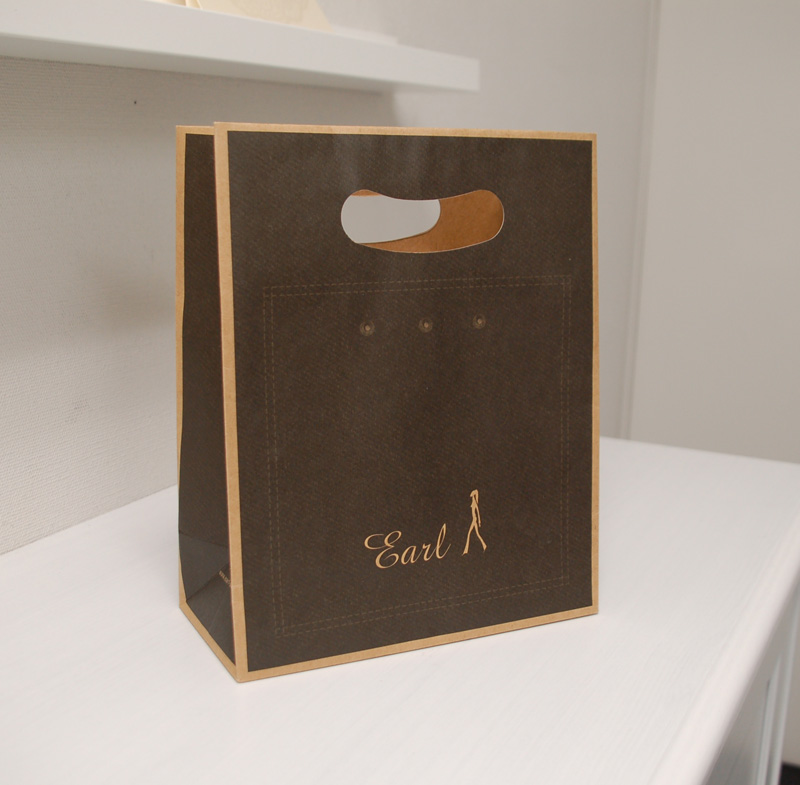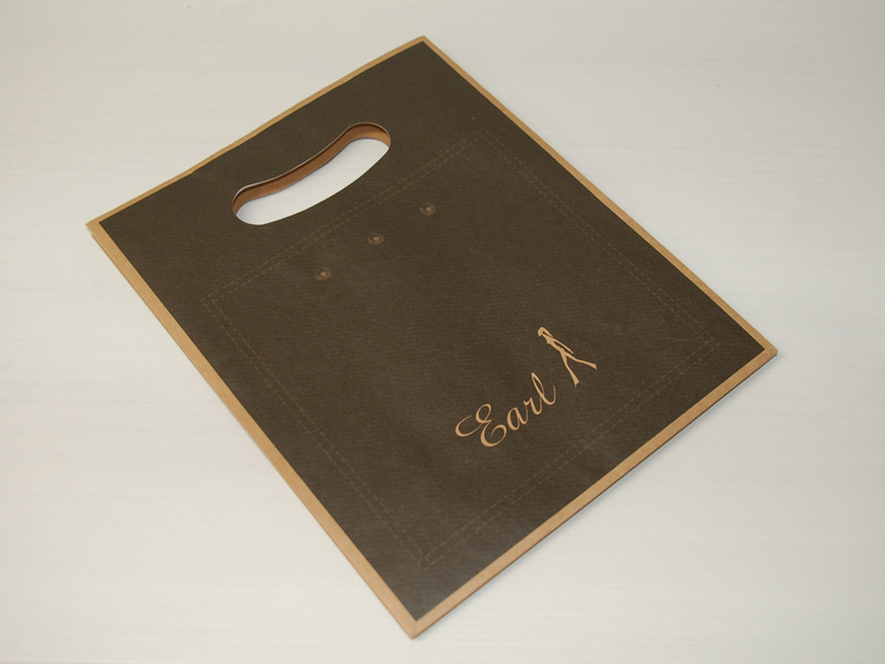 手軽でかわいい小判型手抜き穴ショップ袋2012年06月01日 こんにちはベリービーの芦谷です。 今日はかわいい小判型手抜き穴紙袋をご紹介します。 クラフト紙をベースに茶色一色の印刷です。 小判型手抜き穴とは、 手持ちのところをトムソンで小判の形に抜いてある加工方法です。 作りもシンプルで価格的にも安い割には 見た目がかわいいですね。