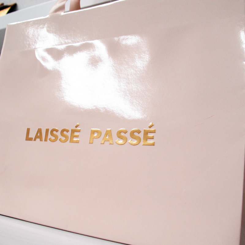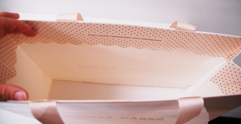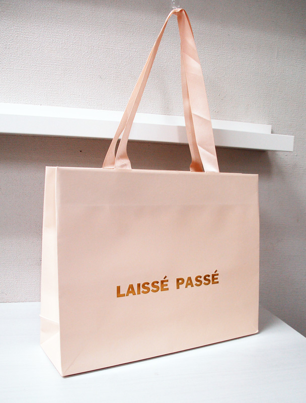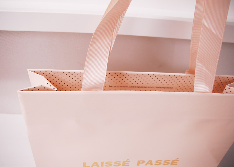 さりげない女性らしさが素敵なショップ袋2012年06月08日 こんにちはベリービーの芦谷です。 今日はフェミニンな紙袋をご紹介します。 ヌードピンクが素敵な紙袋です。 エナメルのバッグの質感をイメージした グロスPP加工に浮きだしゴールドの箔押しが高級感を醸し出しています。 手提げ紐は 近頃、流行のグログランテープを縦留め加工しています。 この紙袋の素敵なのは 口折りの加工ですね。 一般的にまっすぐに切られている口折りを レースのようにトムソン型で抜き取られています。 この見えないところに対するデザインが “オシャレ”感を強調している紙袋ですね。