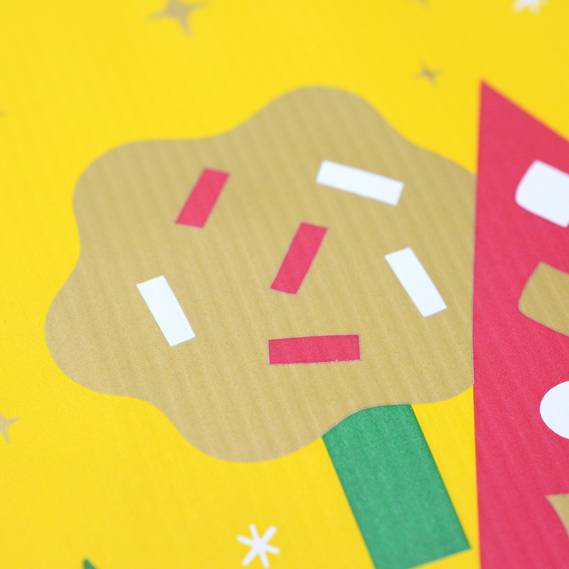 抽象的な形を組み合わせて表現されたクリスマスツリーたちが、