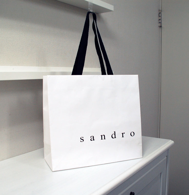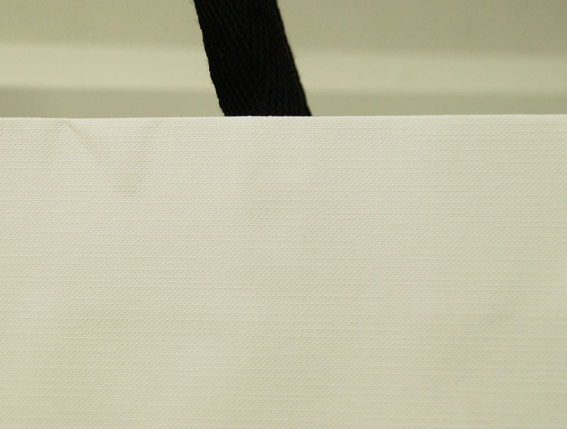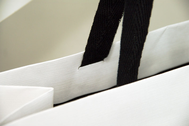 ヨーロッパのショップ袋シリーズ−12012年06月16日 こんにちはベリービーの芦谷です。 今日からヨーロッパの紙袋を何点かご紹介します。 今日、ご紹介するのは とってもシンプルでカッコイイ紙袋です。 シンプルで上品な白いベースに 浮きだし箔押しのロゴマークがカッコイイですね。 紙袋の表面全体には ジャガードのエンボス加工がされています。 シンプルなだけじゃない高級感を作っています。 手提げ紐は黒いアクリル平紐。 縦穴の留め方は紙袋をスッキリ見せます。 内側には黒ベタの印刷がされています。 とっても無駄の無い、シンプルで美しい紙袋ですね。