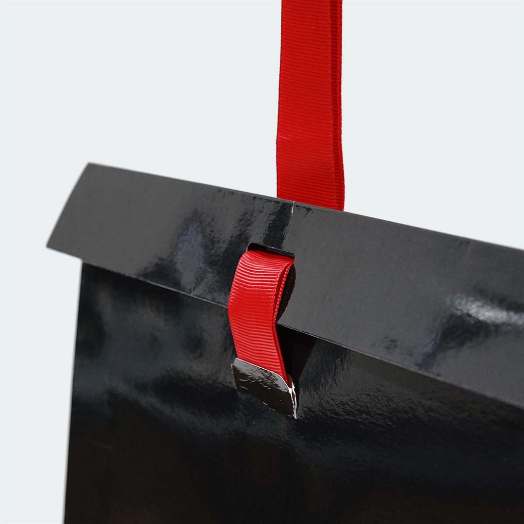 赤いリボンで口を留めて、それが持ち手にもなっていますね。
