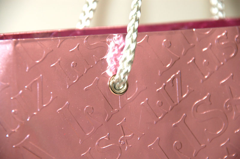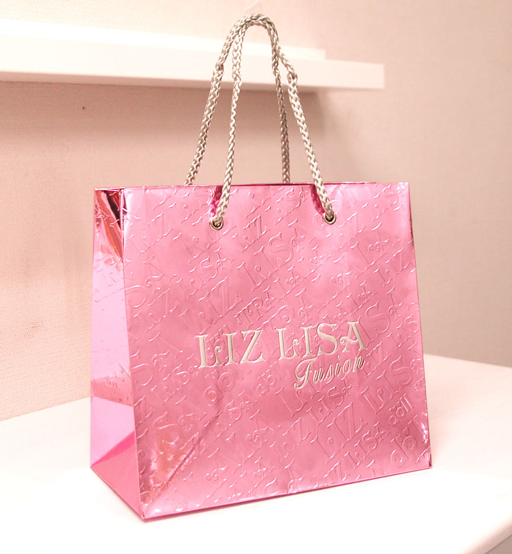 今、流行の蒸着紙ショップバッグ!!2012年06月29日 こんにちはベリービーの芦谷です。 今日、ベリービーの紙袋を製造している中国の工場から送られてきた 新しい紙袋をご紹介します。 先日に引き続き、“蒸着紙”の紙袋です!! 表面にはかなり深いエンボス加工によるロゴマークのパターンが プリントされています。 この紙袋はシルバーの蒸着紙に透過性のあるピンク色が プリントされているようです。 浮きだし処理のロゴマークがカッコイイですね!! シルバーのハトメが使用されてゴージャスな仕上がりです。