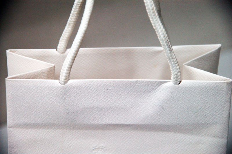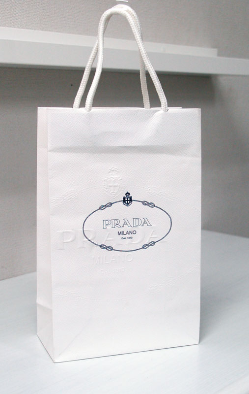 石膏のような美しいショップ袋2012年07月03日 こんにちはベリービーの芦谷です。 今日は石膏像のような“白”が美しい紙袋をご紹介いたします。 純白の塗工紙の全面に本革のような「しぼ加工」を思わせる エンボス柄がプレスされているのが特徴的です。 そのエンボス柄の上にさらに浮きだし加工がされています。 ロゴマークはこれでもかというように 細かい箔押しです。 エクセルフィラメントの紐を縦穴で取り付けてあります。 紙袋全体をかなりスッキリ見せることができるので 近頃の高級紙袋は縦穴式の紐留めが常識となっていますね。