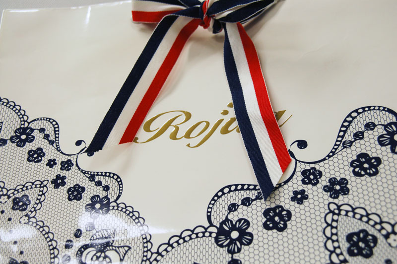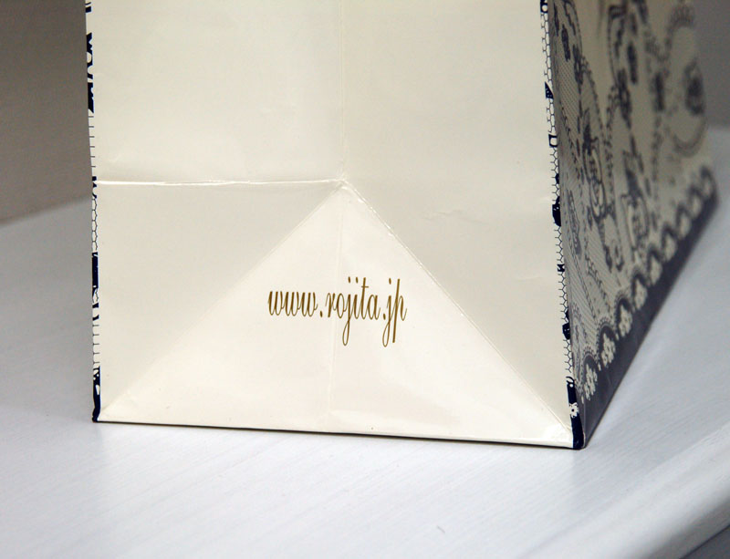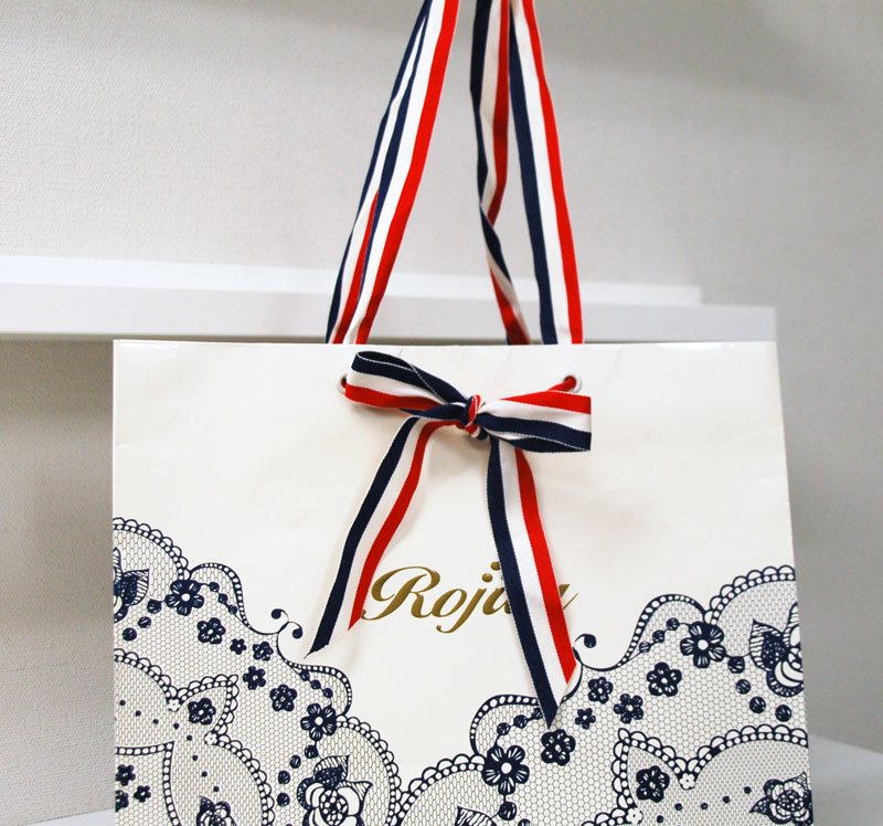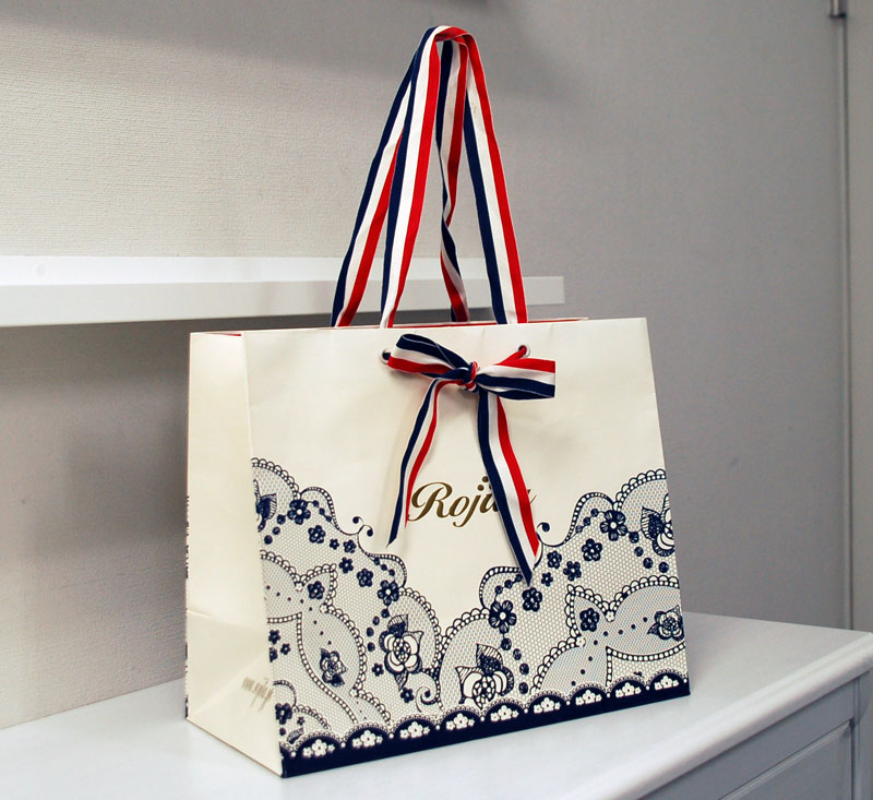 リボン使いが素敵なショップ袋2012年07月09日 こんにちはベリービーの芦谷です。 今日はリボンのアクセントが素敵な紙袋をご紹介します。 トリコロールのリボンがとっても印象的です。 手提げ紐にグログランテープを使用していますが、 通常の単色だけでは無く、このリボンのように 3色の組み合わせのリボンもあります。 ロゴは浮き出しで印象的ですね。 この紙袋のように リボンにアクセントを加えるだけで かなりの存在感を引き立てます。 サイドにはシンプルにURLが印刷されています。 やはり内側にインパクトのあるカラーを配置するのが 今っぽい仕様ですね。