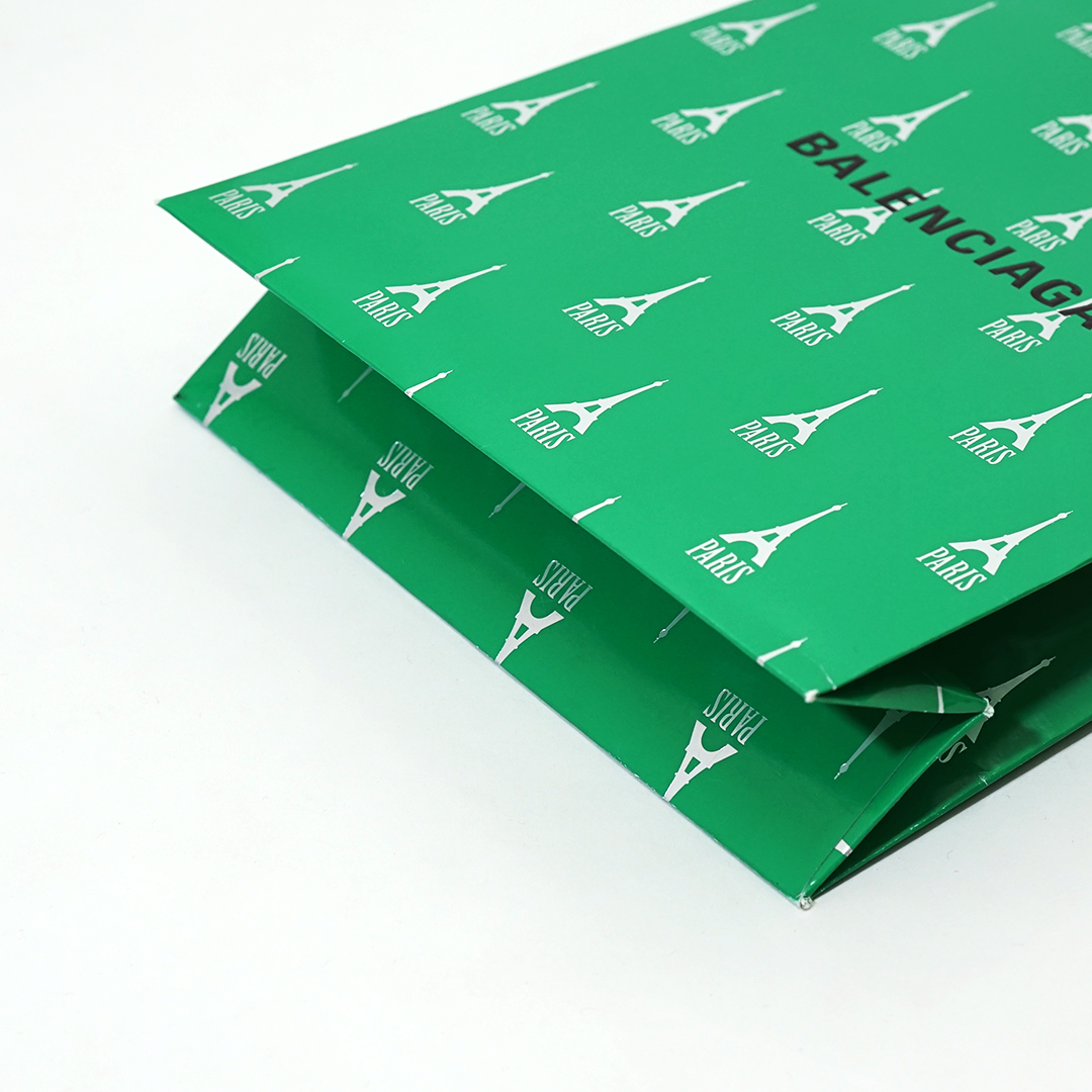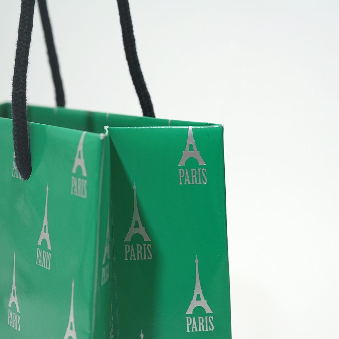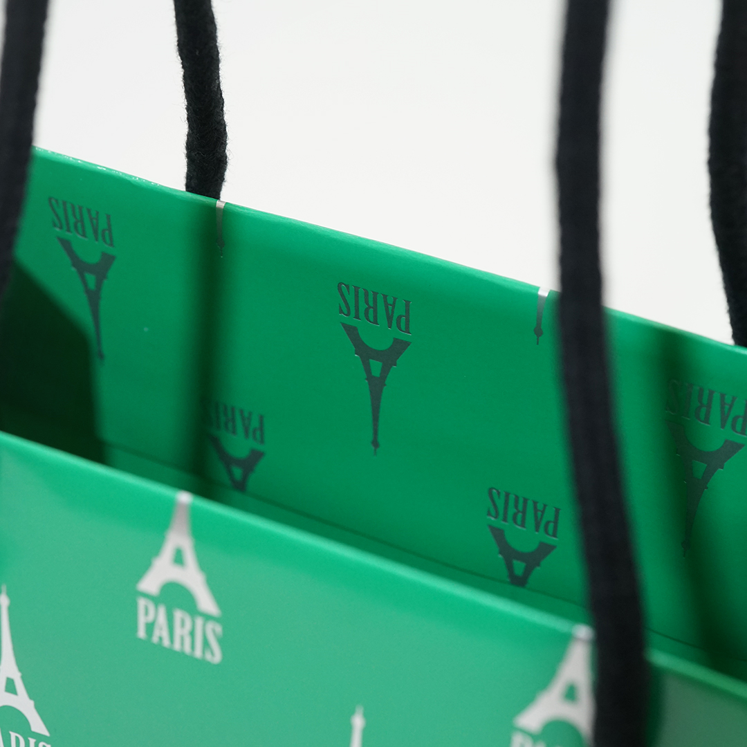 昨年からよく見られる原色のグリーンを使った紙袋。