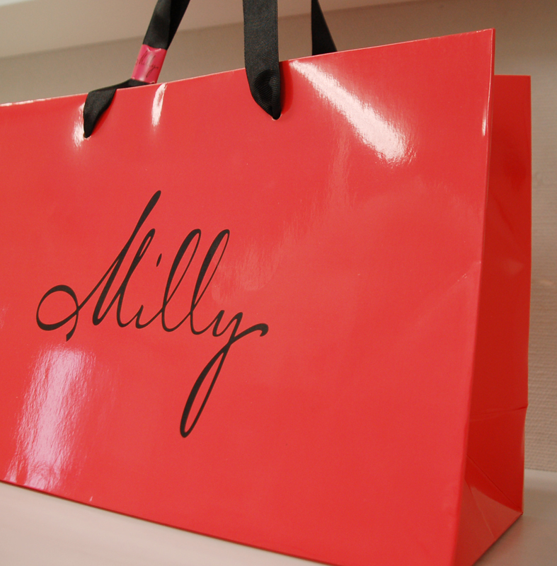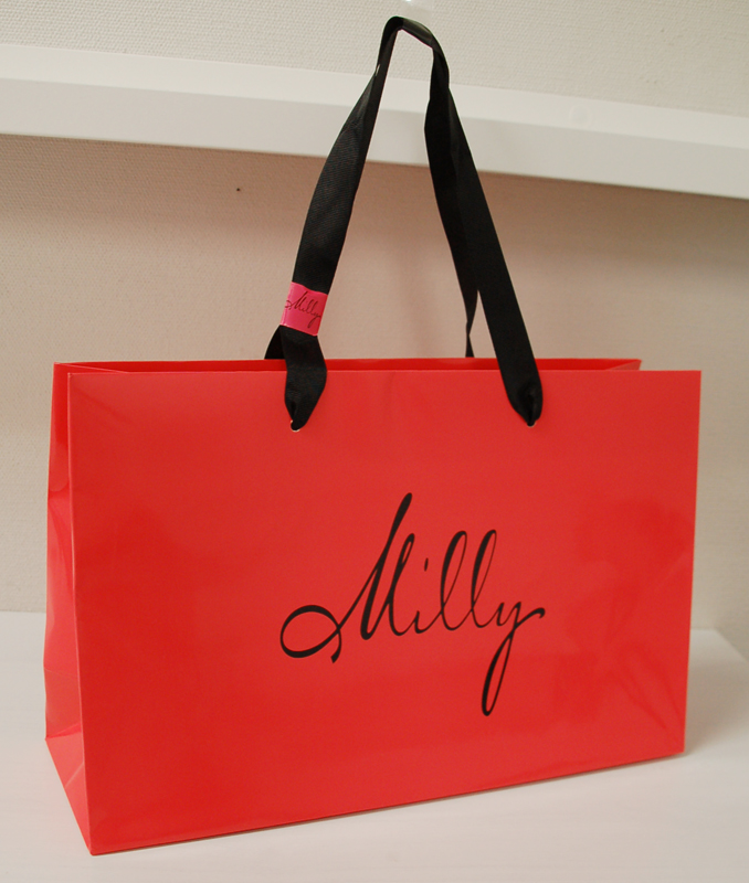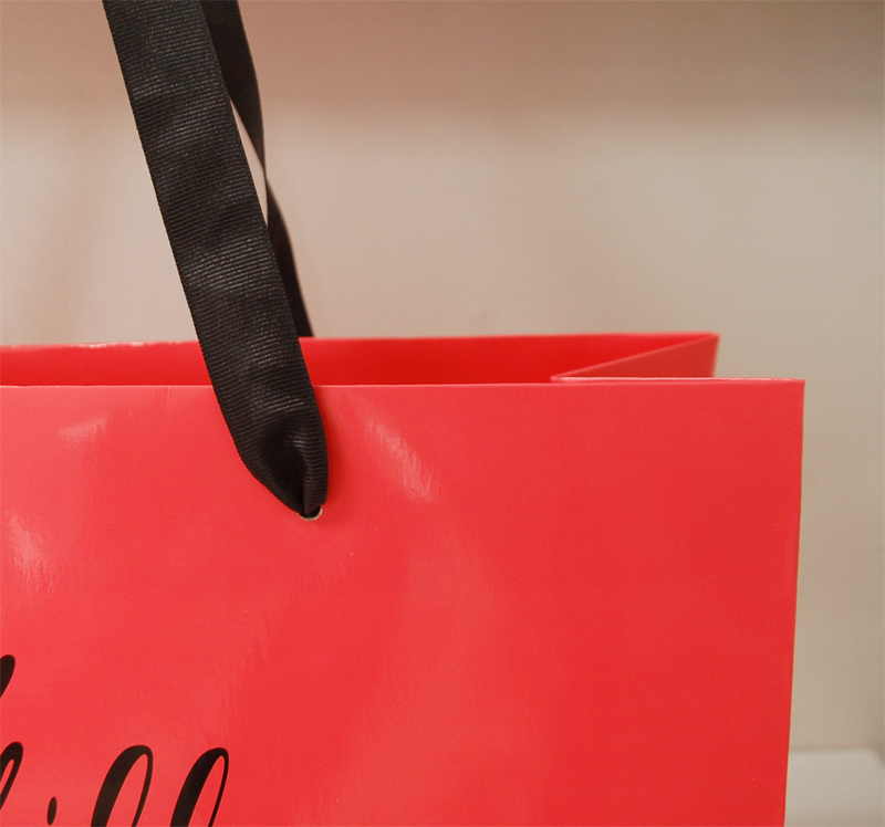 鮮やかなレッドオレンジの色が素敵なショップ袋2012年07月12日 こんにちはベリービーの芦谷です。 今日はとっても鮮やかなレッドオレンジの紙袋をご紹介します。 とってもシンプルな作りの紙袋ですが まさに色で勝負といった感じの素敵な紙袋です。 ロゴマークの黒とグログランテープの黒のバランスがいいですね。 また、グロスPPの光沢感も素敵です。 しかし、つくづく、最近リボン系の手提げ紐が主流を占めていますね。 やはり、流行のようです。