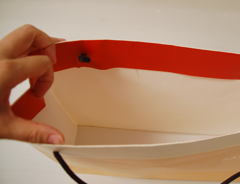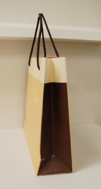 カラーバランスがすてきなショップ袋2012年07月13日 こんばんは!ベリービー辻です。 今日はカラーのバランスがすてきな ショップ袋をご紹介します。 ひもを通す穴間が広くてステキ! ハンドルはスピンドルです。 側面はこんな感じ。 口折りの部分は鮮やかなオレンジです! 外面はやわらかい印象ですが 口折りにオレンジを使用することで しまったデザインに仕上がっていますね! すてきなバランスのオリジナル紙袋です。