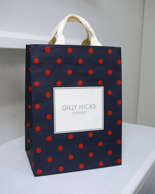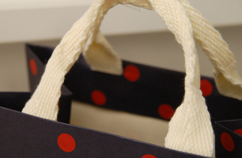 ドット柄がかわいいショップ袋2012年07月15日 こんにちはベリービーの芦谷です。 みなさん、連休いかがお過ごしですか? 私は相変わらず、紙袋三昧な毎日です… さて、本日、ご紹介する紙袋はドットパターンが素敵な紙袋です。 紺色に赤い水玉が素敵な紙袋です。 この紙袋のも一つの特徴は ロゴマークをわざわざラベルにして 貼り付けていることです。 なんか、高級感ありますね。 それから、コットンのとてもしっかりした手提げ紐も特徴的です。 最後に底ボールに印刷されたメッセージ。 「ホームページを見てね!!」 うーんストレートで素敵すぎるメッセージです。