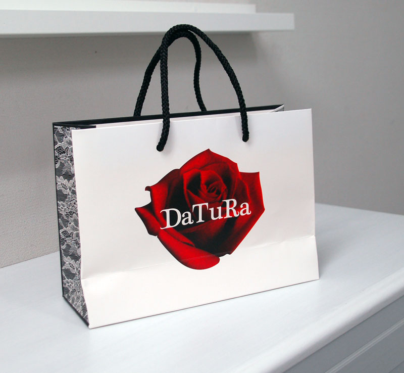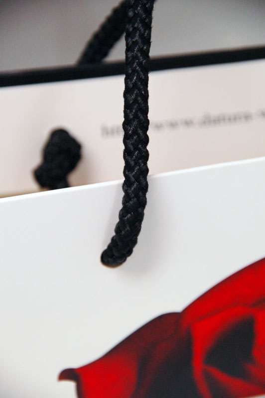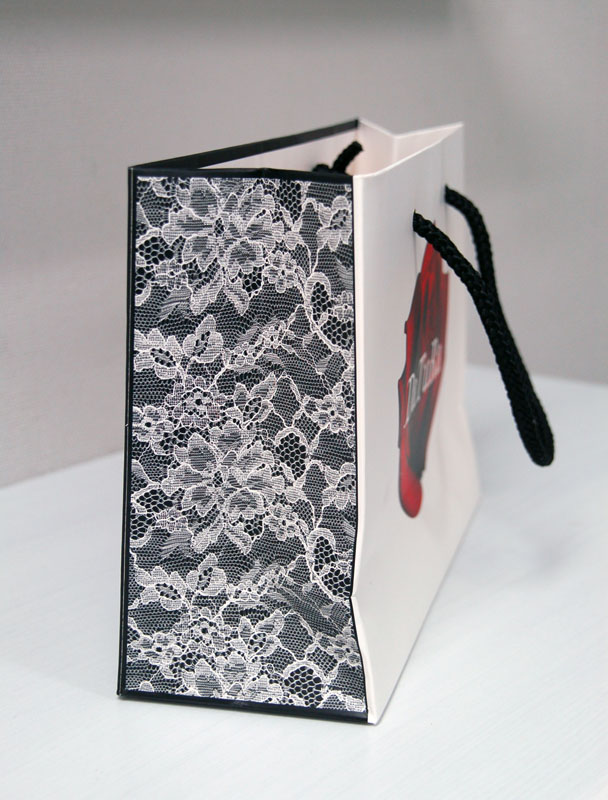 ドラマティックな“薔薇”が素敵なショップ袋2012年07月25日 こんにちはベリービーの芦谷です。 今日はとてもストリー性を感じさせる紙袋をご紹介します。 A面、B面に飾られた薔薇のデザインをダイナミックに切り替えています。 サイドにはとってもフェミニンなレース柄がデザインされています。 近頃、口折りに入れるURLは常識になってきました。 200gぐらいのカード紙(硬い紙)を使われていて、 存在感のある紙袋です。