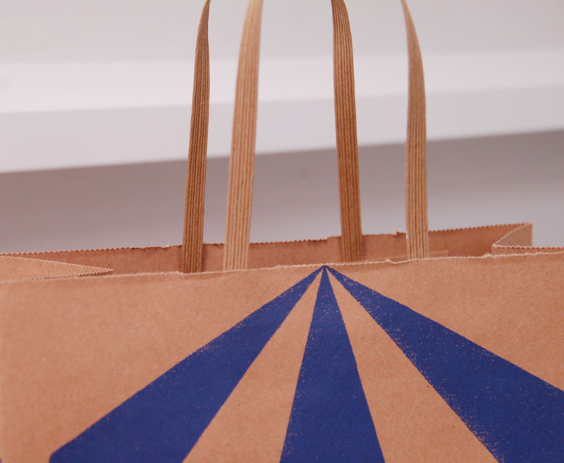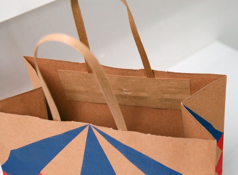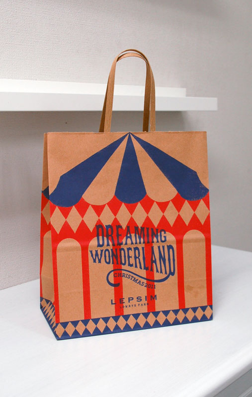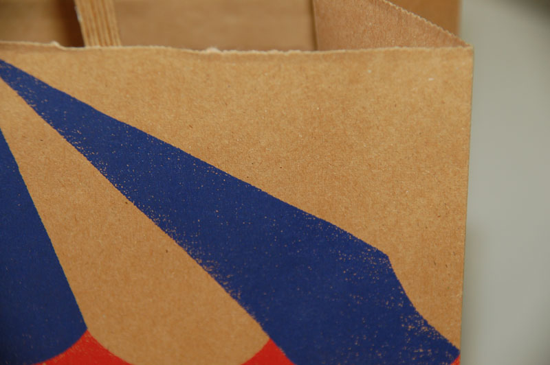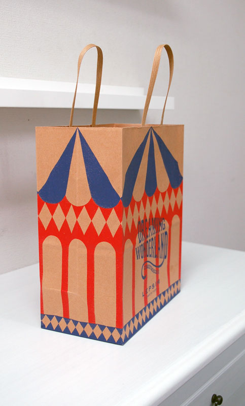 おもちゃ箱のような、かわいいショップ袋2012年07月30日 こんにちはベリービーの芦谷です。 今日はまるでオモチャ箱のようなかわいい紙袋をご紹介します。 海外製の粗めのクラフト紙にフレキソで印刷されています。 立体的にデザインされているのでサイドから見るとますますオモチャ箱です。 フレキソ印刷は細かい表現が印刷できず、非常に荒っぽい仕上がりになる印刷方法ですが この紙袋はその荒っぽい印刷の質感を見事に生かしています。 紙バンドの素朴さも、この紙袋のデザインにはピッタリですね!!