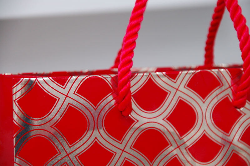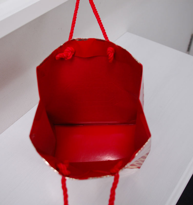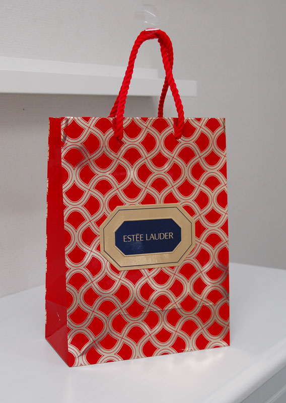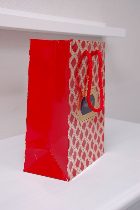 キラキラ、ゴージャスなショップ袋2012年08月06日 こんにちはベリービーの芦谷です。 今日はとってもキラキラでゴージャスな紙袋をご紹介します。 金色の蒸着紙にUVインクで印刷された紙袋です。 ロゴマークは金色の箔押し。 キラキラの極みです。 手提げ紐はツイストロープ、高級感を引き出すの最適な紐ですね。 内側には真っ赤な印刷。 ゴージャスですね。 やはり、女性を美しくする商品のパッケージはゴージャス感が大切ですね。