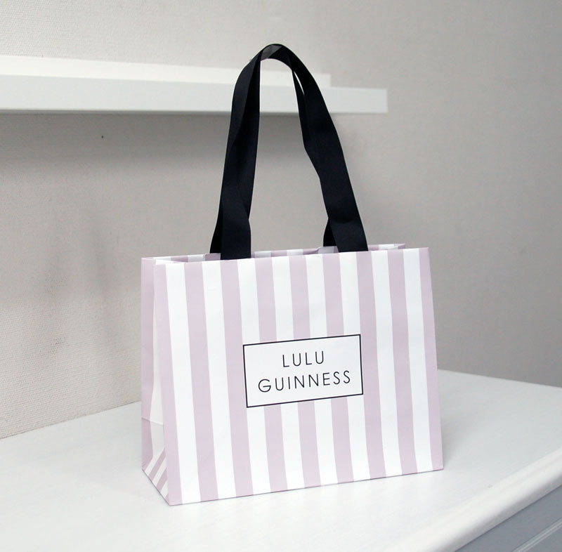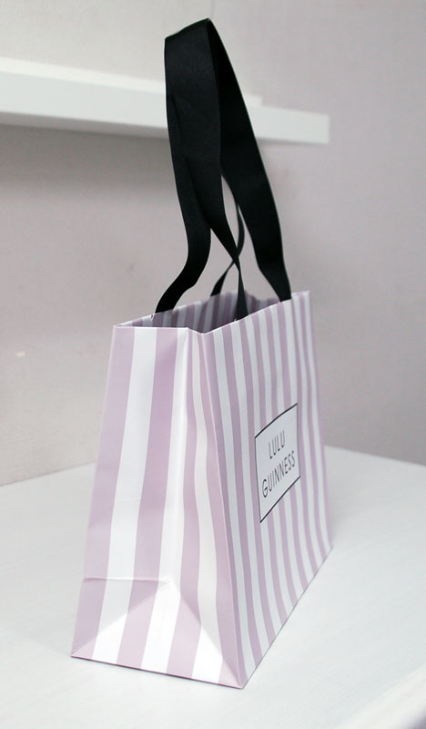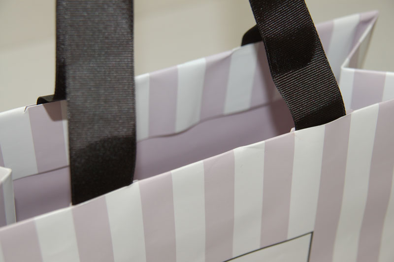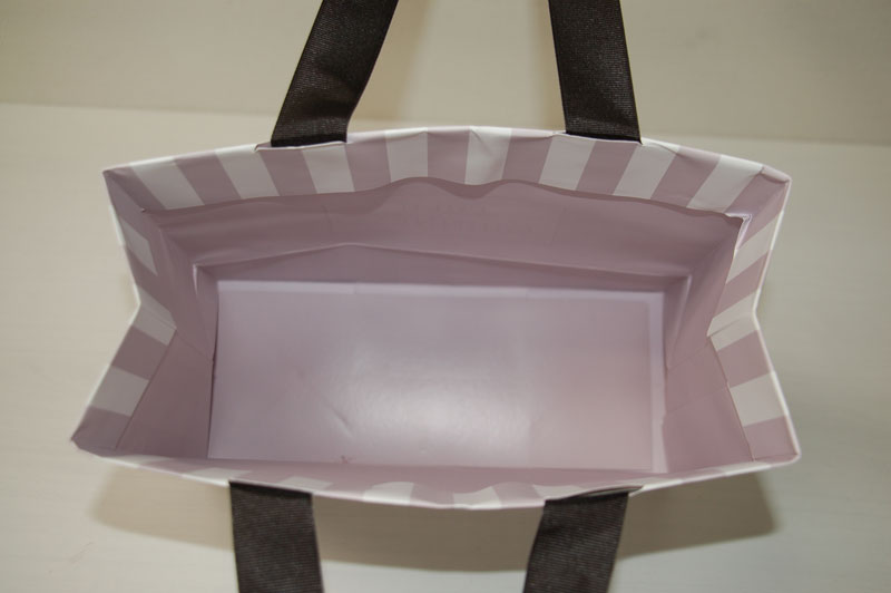 涼しげで清楚なショップ袋2012年08月08日 こんにちはベリービーの芦谷です。 今日はとっても涼しげで清楚な紙袋をご紹介します。 藤色のストライプが素敵です。 繊細なゴシック体のロゴがとても紙袋デザインにマッチしています。 横から見るとメリーゴーランドのパラソルのようですね。 手提げ紐は黒いグログランテープ、縦留め式と定番のスタイルです。 中に印刷された藤色のベタ面が一段と清楚さを強調しているとっても素敵な紙袋です。
