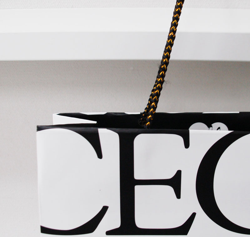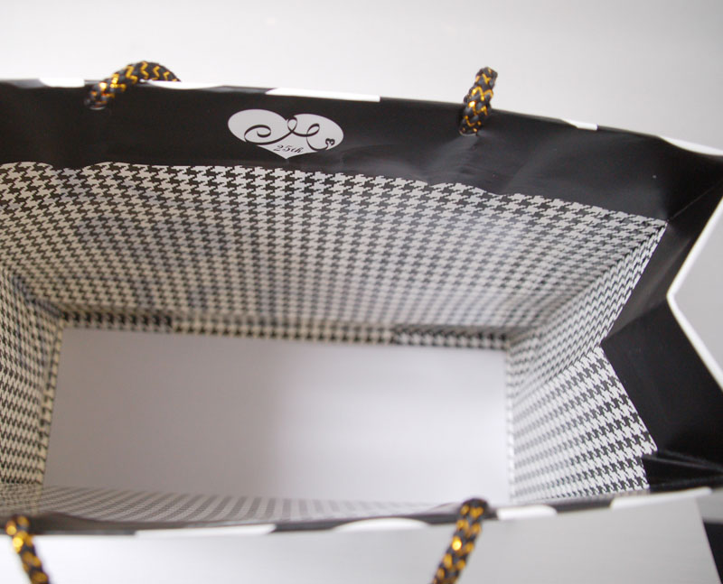 グラフィックがカッコイイ!!ショップ袋2012年08月13日 こんにちはベリービーの芦谷です。 今日も暑い暑い、お盆の一日です。 今日はグラフィックがカッコイイ!!紙袋をご紹介します。 大胆なロゴマークのプリントに箔押し加工です。 内側にも大胆な千鳥格子模様が素敵ですね。 手提げ紐は縦留めでキラキララメ入りのスピンドルです。 グラフィックを使った表現力豊かな紙袋ですね。