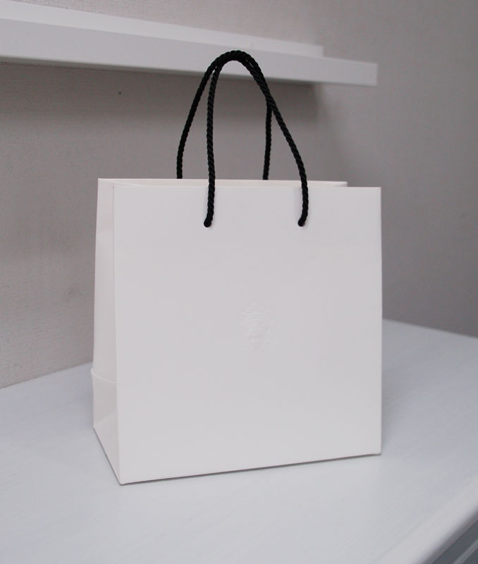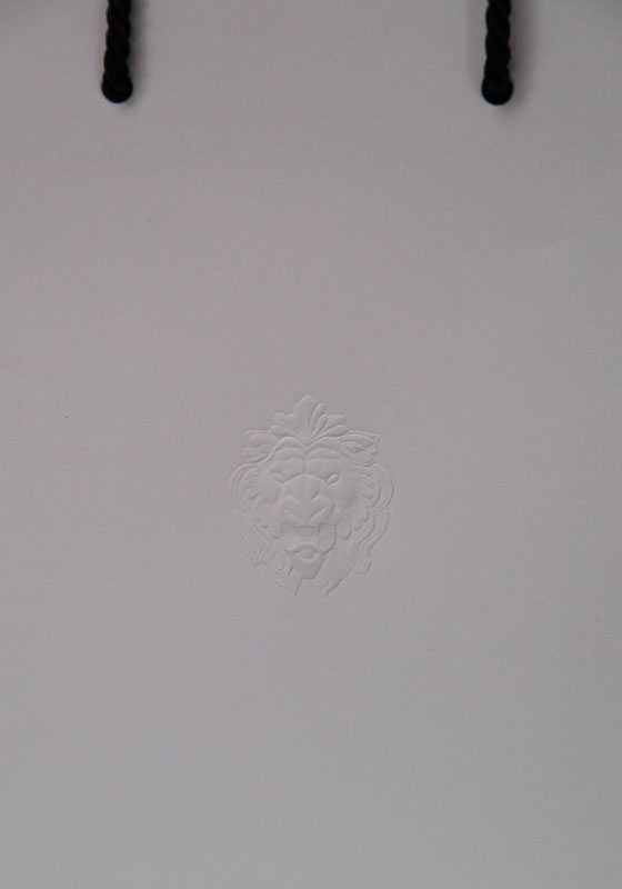 カメオのようなショップ袋2012年08月26日 こんにちはベリービーの芦谷です。 今日はカメオのような贅沢な紙袋をご紹介します。 一見、何もない、シンプルな白色の紙袋のようです。 少し近寄ってみると、、、、 紙袋の中心に彫刻のようなライオンが 手彫り版によりデザインされています。 とーっても高級感を感じさせますね。 シンプルなツイストロープが高級感をさらに盛り上げてくれますね!!