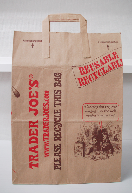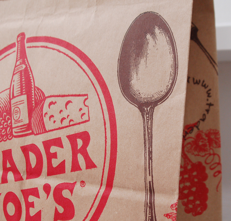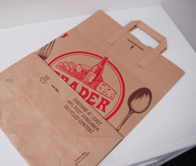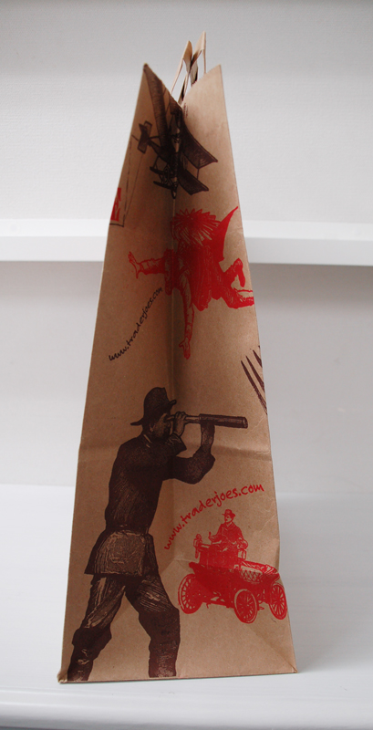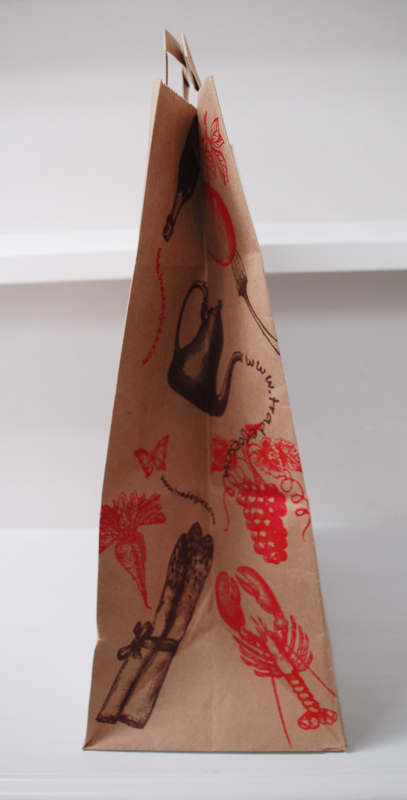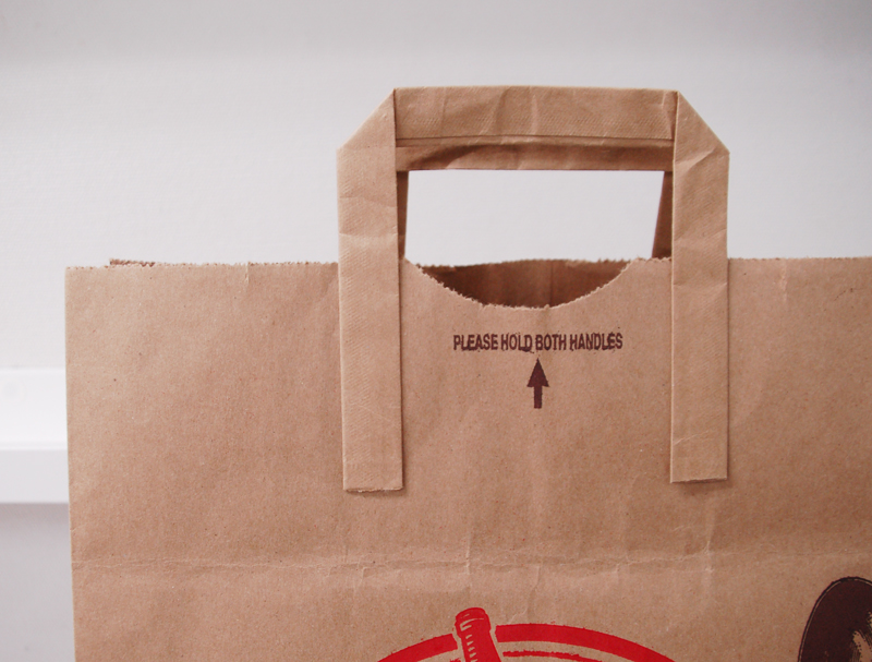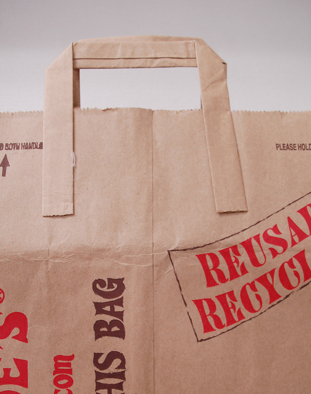 アメリカのクラフトショップ袋2012年08月31日 こんばんは、ベリービーの辻です。 今日はアメリカの クラフト紙ショップ袋をご紹介します。 絵柄がショップ袋をぐるっと1周しています。 ハンドルは外側にボンドで取りつけられています。 印刷は、フレキソ印刷(「ゴム印」のような印刷方法)です。 イラストの雰囲気と印刷方法がマッチしていますね! これは珍しい!! 紙の貼り合わせ部分がセンターにきています。 底はこんな感じ。 海外のクラフト紙は 日本のものと比べてザラザラして 不純物が多いです。 その良さを活かした 素敵なショップ袋ですね!
