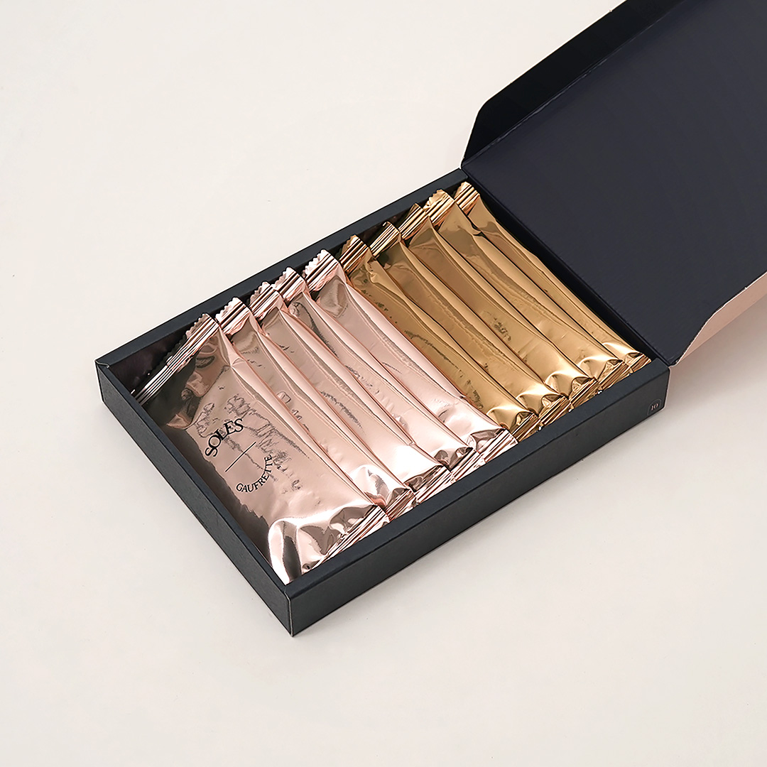 この重厚感あるインナーカラーは、中のキラキラした個包装パッケージをより一層際立たせて見せる効果がありますね!