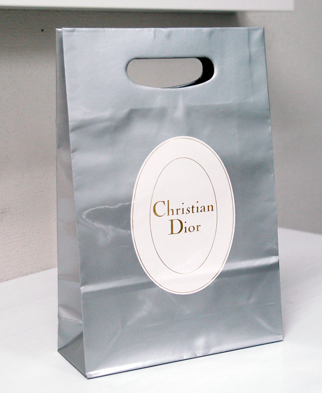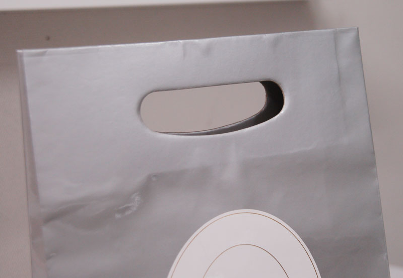 キラキラの小判型手抜きショップ袋2012年09月03日 こんにちはベリービーの芦谷です。 今日はとってもシンプルな小判型手抜きタイプですが キラキラゴージャス感を演出した紙袋をご紹介します。 グロスPPを貼ったシルバー地の紙袋に箔押しのロゴマークです。 クラシカルでシンプルなデザインが素敵です。 小判型の手抜きというのもなんだか新鮮でいいですね。