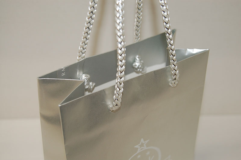 シアーな質感がステキなショップ袋2012年09月07日 こんにちはベリービーの芦谷です。 今日はつや消しシアーなシルバーが素敵な 紙袋をご紹介します。 きらきら感で存在感がありますが、どこか落ち着きのある 素敵なデザインですね。 フランスチックなイラストロゴが素敵です。 紙袋本体の存在感を際立たせる、ラメ入り手提げ紐のバランスが抜群ですね。