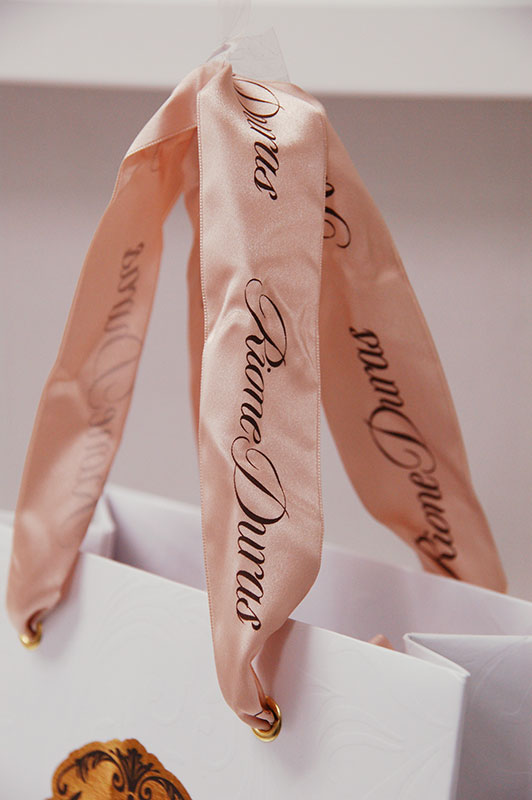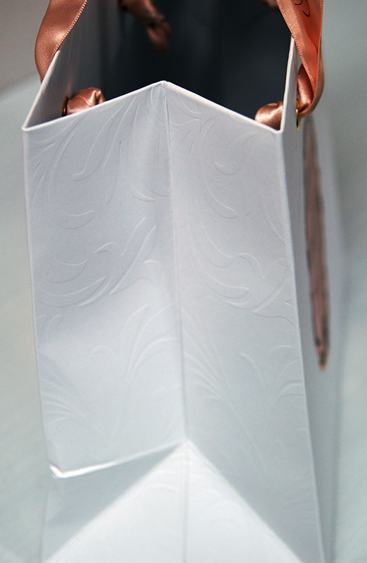 とてもゴージャスな紙袋2012年09月13日 こんにちはベリービーの芦谷です。 今日はとってもシンプル、ゴージャスな紙袋をご紹介します。 白地のセンターにどーんと箔押し。 その周囲には繊細なエンボスが… 箔押しの周囲にあるクラシカルなエンボス柄。 サイドにもエンボス柄があります。つまり、全面エンボス!! かなり高価な仕様ですね。 手提げ紐にはサテンリボンが使われ、ゴールドのはと目が留められています。 すごく太い目のサテンリボンにはオリジナルのネームがプリントされています。 う〜ん、どこまでもこだわった紙袋ですね。