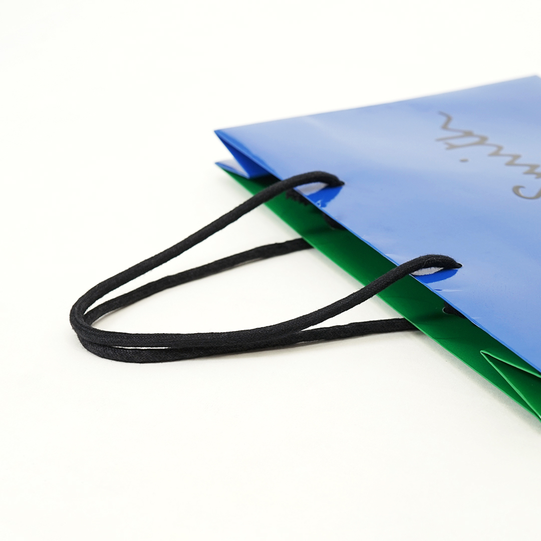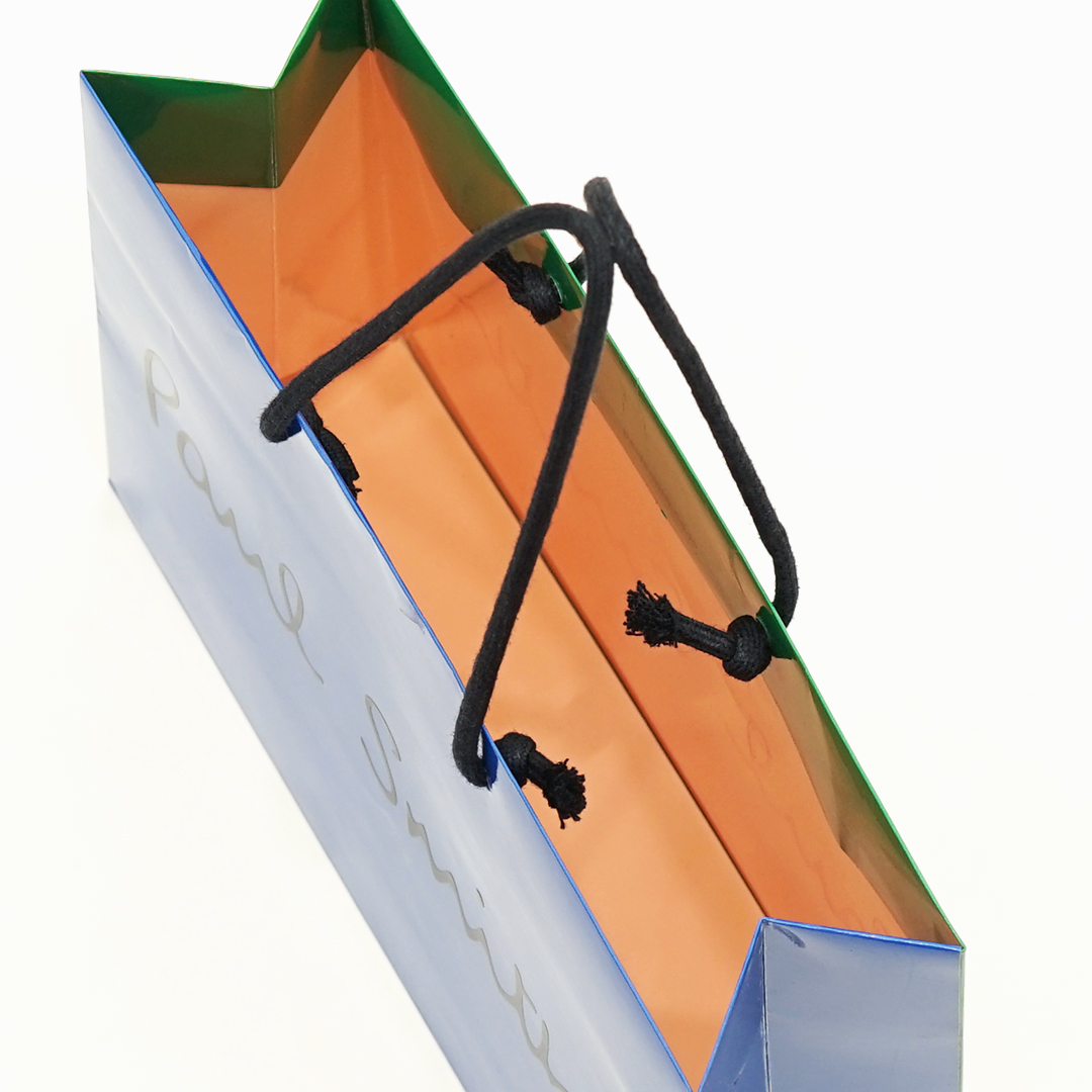 この加工によって、紙袋全体が光沢を帯び、華やかさと高級感が際立っています。まるで鏡のように反射する光が、ブランドの個性をさらに引き立てています。