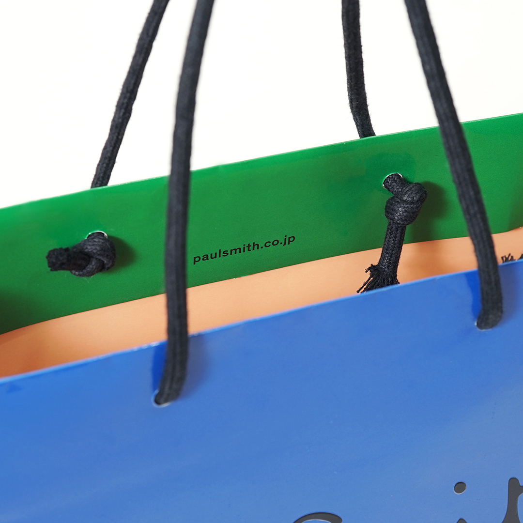 この紙袋は、表面と裏面で異なる鮮やかなカラーが使われているのがポイントです。