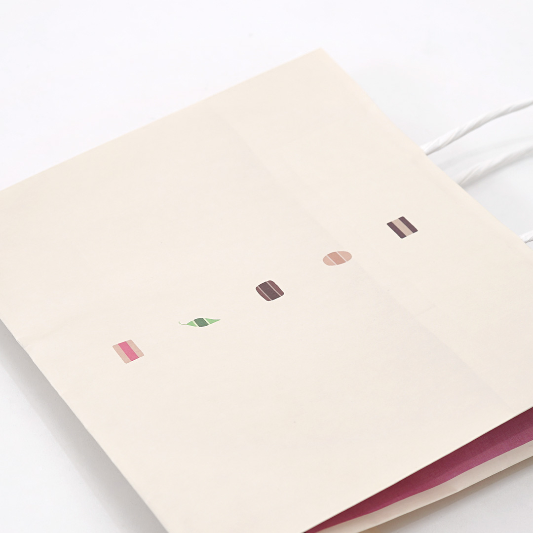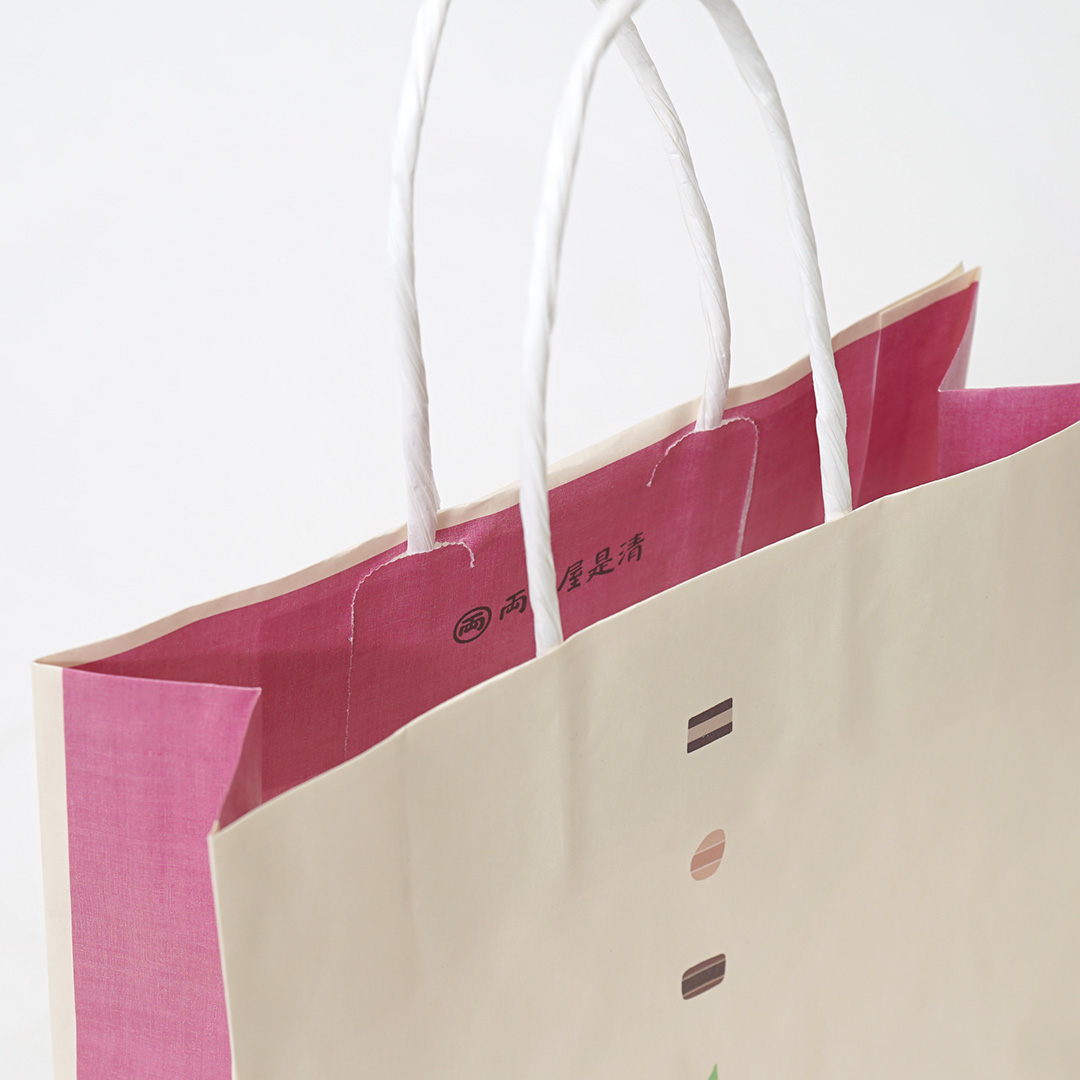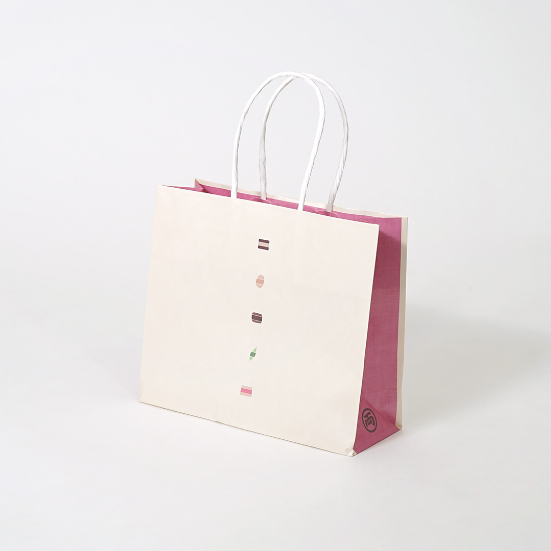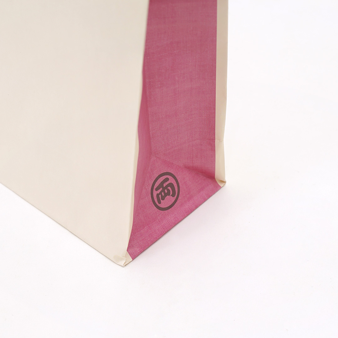 紙袋のマチ部分には、落ち着いたピンク色が採用されており、全体に華やかさがありながらも上品な雰囲気を醸し出しています。