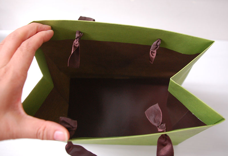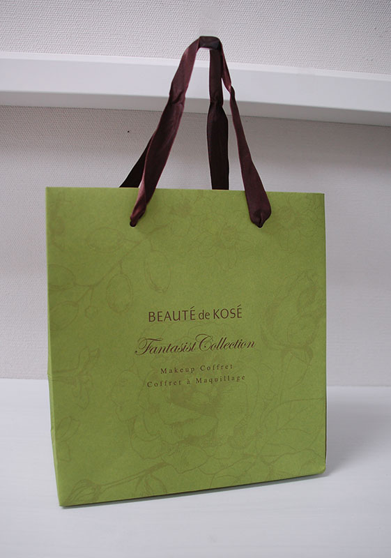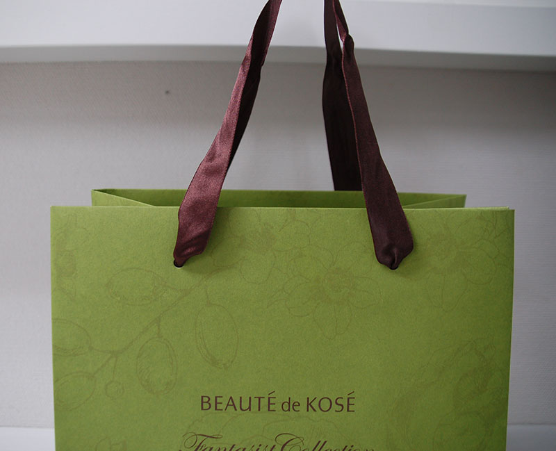 ナチュラル感が素敵な紙袋2012年09月14日 こんにちはベリービーの芦谷です。 今日は素材を生かしたナチュラル感たっぷりの紙袋をご紹介します。 厚手の片艶晒クラフトにモスグリーンが全面プリントされています。 モスグリーンの中にはうっすら花模様が薄いブラウンでプリントされています。 晒クラフトのざらっとした質感ととてもマッチしたデザインです。 手提げ紐には流行のサテンリボンが使用されています。 内面、底ボールにもブラウンの全面ベタがプリントされています。 シンプルな質感の素材も 使い方によって高級感を演出できる例ですね。