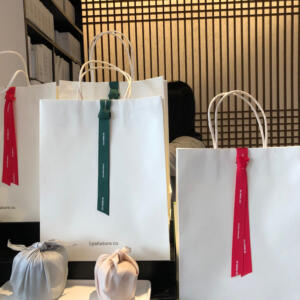こちら紙袋自体はシンプルですが、別途取り付けられた口留めのシールやリボンがポイントになっています。