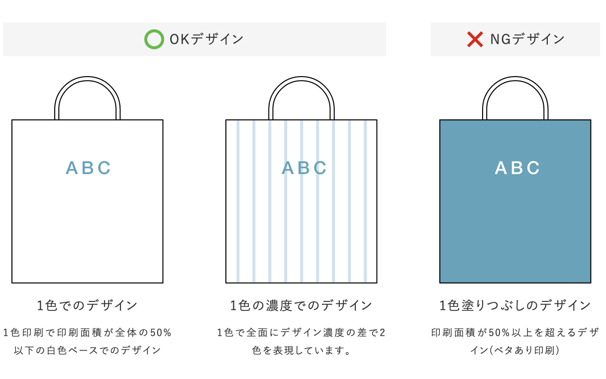 ただし、印刷面積が50%を超える1色塗りつぶしのデザインは不可ですのでご注意ください!
