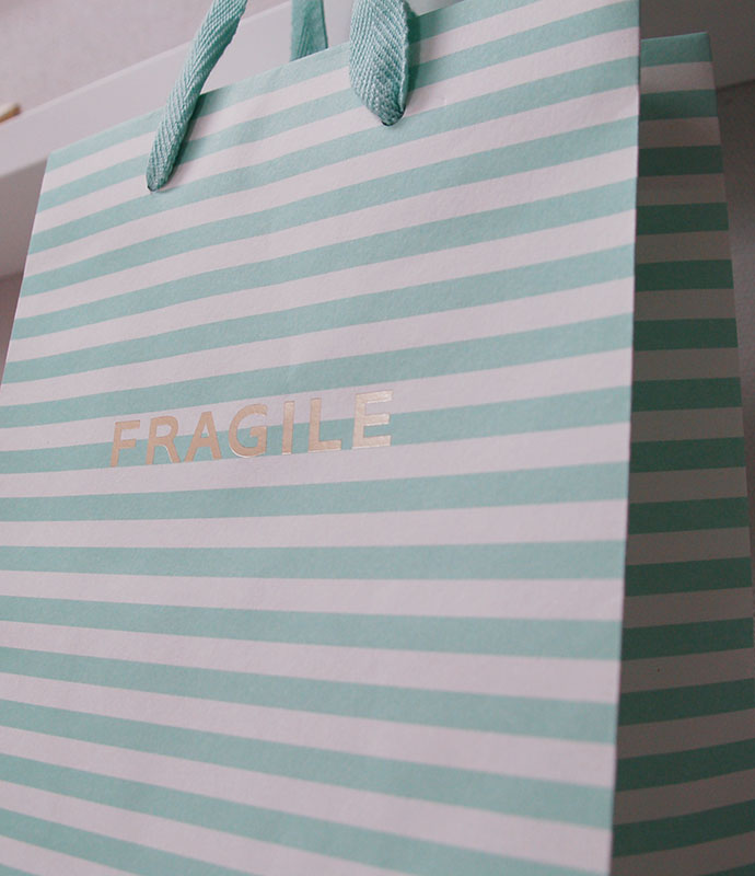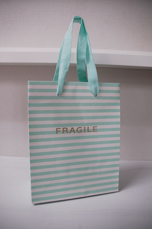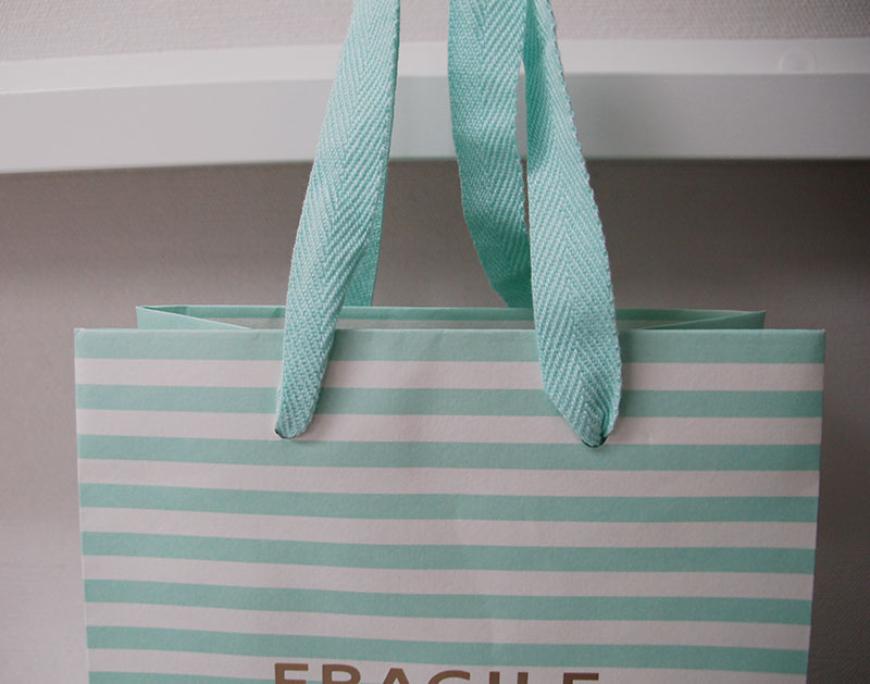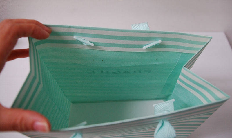 とても爽やかボーダーの紙袋2012年09月23日 こんにちはベリービーの芦谷です。 今日はとても爽やかなボーダーの紙袋をご紹介します。 爽やかなペパーミントグリーンのストライプが素敵ですね。 おとなしめのつや消し箔押しロゴが素敵なバランスです。 紙袋のベースに合わせて染められた平紐の手提げ紐。 近頃では定番となった、 内側印刷。表の色に合わせたペパーミントブルー。 夏の終わりにすっきりした紙袋のご紹介でした。