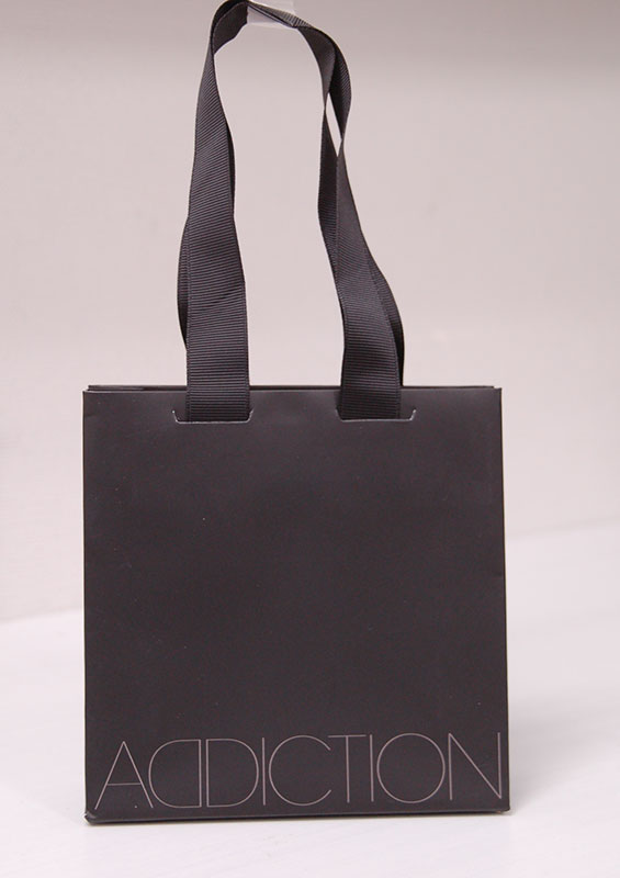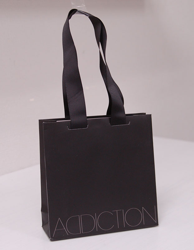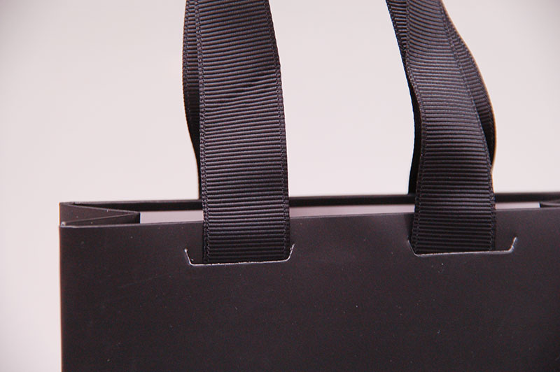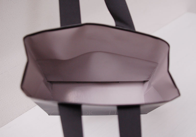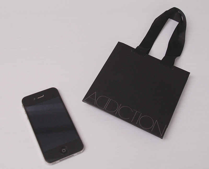 小さくてエレガントな紙袋2012年09月26日 こんにちはベリービーの芦谷です。 今日はとっても小さいながらエレガントな紙袋をご紹介します。 縦横130mm、マチサイズ45mmというとっても小さな紙袋ですが、 大きなサイズに負けないエレガントさを持っています。 私のi-Phoneと比べると大きさがよくわかります。 黒いマットベースに繊細で上品なグレーのロゴが配置されています。 小さいながらもグログランテープの縦留めというこった仕様です。 内側にはロゴの色と同じ上品なグレーベタのプリントです。