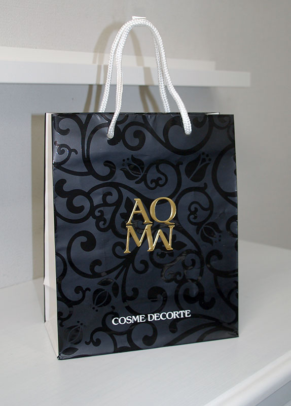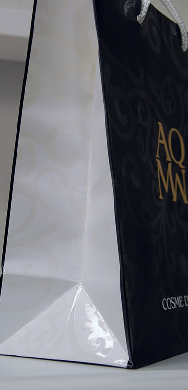 UVをゴージャスに生かした紙袋2012年10月04日 こんにちはベリービーの芦谷です。 今日はUV印刷をゴージャスに生かした紙袋をご紹介します。 大人っぽい黒をベースにした素敵なデザインです。 紙袋の表面にはUVでオーナメントがプリントされています。 ちょっと画像ではわかりにくいですが マチにもUV印刷でオーナメント柄が印刷されています。 箔押しは手彫り版で浮きだし処理がなされています。 紐は芯入りのパイレンロープ。 大人の女性を感じさせるゴージャスな紙袋ですね。