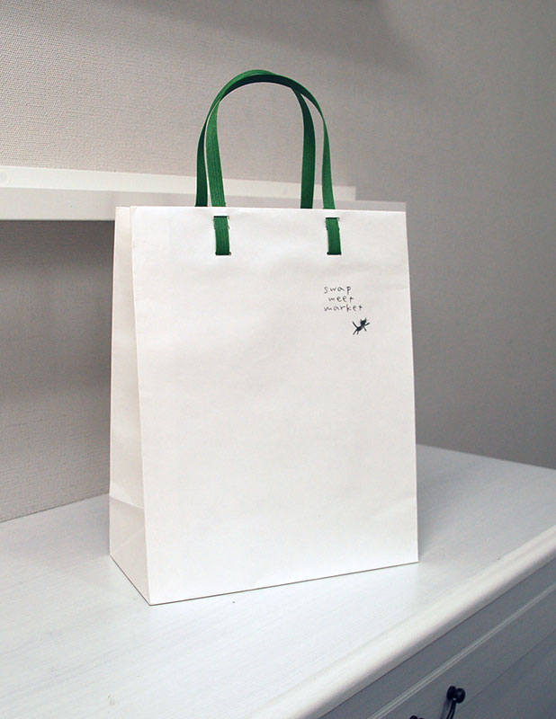 ナチュラルな魅力が素敵な紙袋2012年10月09日 こんにちはベリービーの芦谷です。 今日はとってもナチュラルで素敵な紙袋をご紹介します。 晒しクラフトと紙紐のバランスをうまく使った紙袋です。 かわいい猫のロゴマークがワンポイントに使われています。 そして、この紙袋の最大の特徴は手提げ紐の留め方です。 通常、リベットやのり留めでかみ紐を取り付けますが この紙袋は折り返しに紙紐を通してとめています。 とっても斬新な取り付け方ですが インパクト抜群です。
