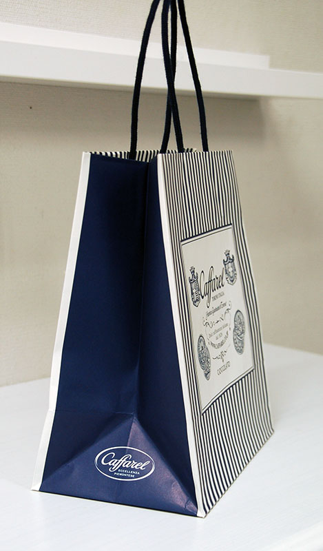 クラシカルで素敵なデザインの紙袋2012年10月11日 こんにちはベリービーの芦谷です。 今日はシンプルな作りながら クラシカルで素敵なデザインの紙袋をご紹介します。 ノーブルな紺色のストライプにクラシックな飾り罫がマッチしたデザインです。 こういったデザインって、紙袋の素材感を関係無しに 高級感を感じさせますね。 サイドの紺ベタが全体の雰囲気を引き締めています。 芯が入ったエクセルフィラメント紐を使用しています。 このタイプは結び目が無いのと、自立するので紙袋がすっきり見えて人気がありますね。 取り付け方はJカットです。