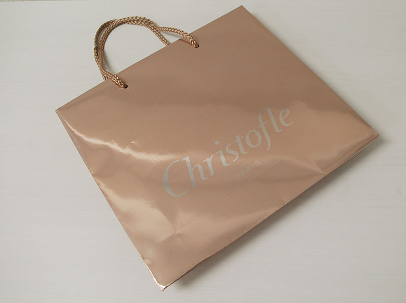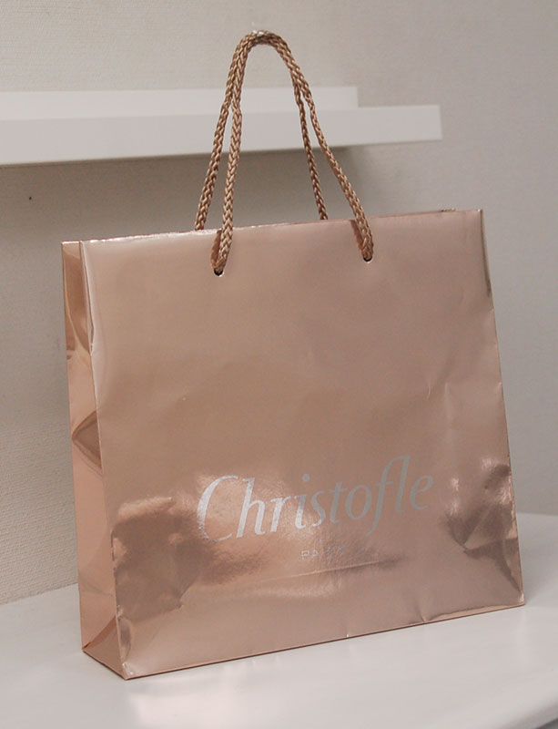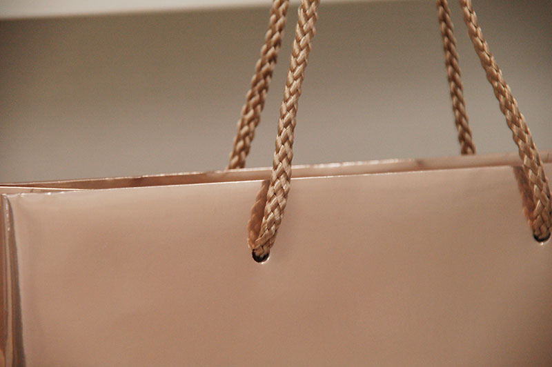 とってもエレガントな紙袋2012年10月13日 こんにちはベリービーの芦谷です。 今日は蒸着紙を使いながらとてもエレガントなデザインの紙袋をご紹介します。 シルバー蒸着紙に薄いヌードピンクが全面に印刷されています。 本来、派手に見える蒸着紙がデザインの方法でエレガントに仕上がっています。 ハンドルはグレーぽいパイレンロープ。 このバランスもいいですね。 とてもシンプルな組み合わせですが バランス次第でとっても素敵になる例ですね。