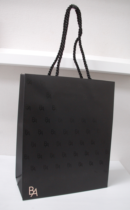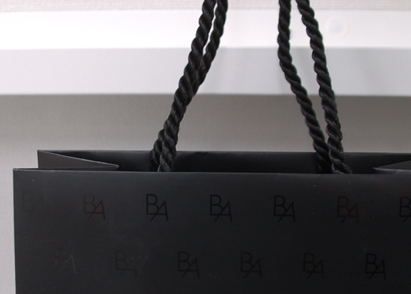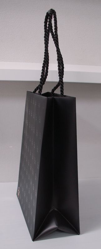 マニッシュなデザインのショップ袋2012年10月16日 こんにちは、ベリービーの辻です。 今日はマニッシュでカッコイイショップ袋を ご紹介します。 ツイストロープでクールさアップ! ハンドルを内側で取り付けているので デザインを損ないません。 ボディはマットにUV印刷で ロゴを印刷。 折り目を底部分にもってきているので 正面に折り目がつきません。 内側はミラーゴールド! デザインを美しくみせるために 細部にこだわりつくした 素敵なショップ袋ですね!