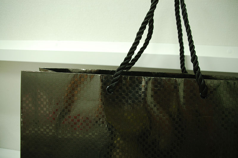 すごく存在感のある紙袋2012年10月20日 こんにちはベリービーの芦谷です。 今日は“存在感”たっぷりの紙袋をご紹介します。 厚手のコート紙の表面全面にエンボス加工がされています。 エンボスによって紙袋と言うよりも 革製品のバッグのような存在感がでています。 太めのツイストロープとハトメ使いが、 一段と紙袋の存在感を強調していますね。