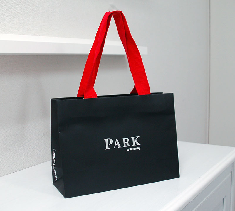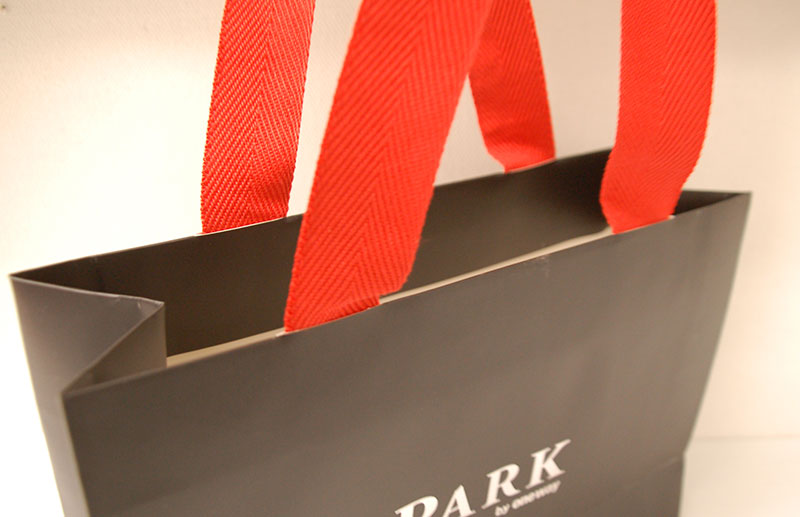 大胆なコントラストで“インパクト大”の紙袋2012年10月22日 こんにちはベリービーの芦谷です。 今日はボディーとハンドルの大胆なコントラストで インパクトたっぷりの紙袋をご紹介します。 マットな黒いボディーと真っ赤な太めの平紐の組み合わせが印象的です。 ロゴマークはシルバー艶有りの箔押し。 サイドにはこちらもシルバー箔押しでURLがプリントされています。 縦留めのハンドルはまさに“真っ赤”!! 太さも30mmありますのですごくインパクトがあります。 シンプルな組み合わせですがとっても印象的な紙袋ですね。